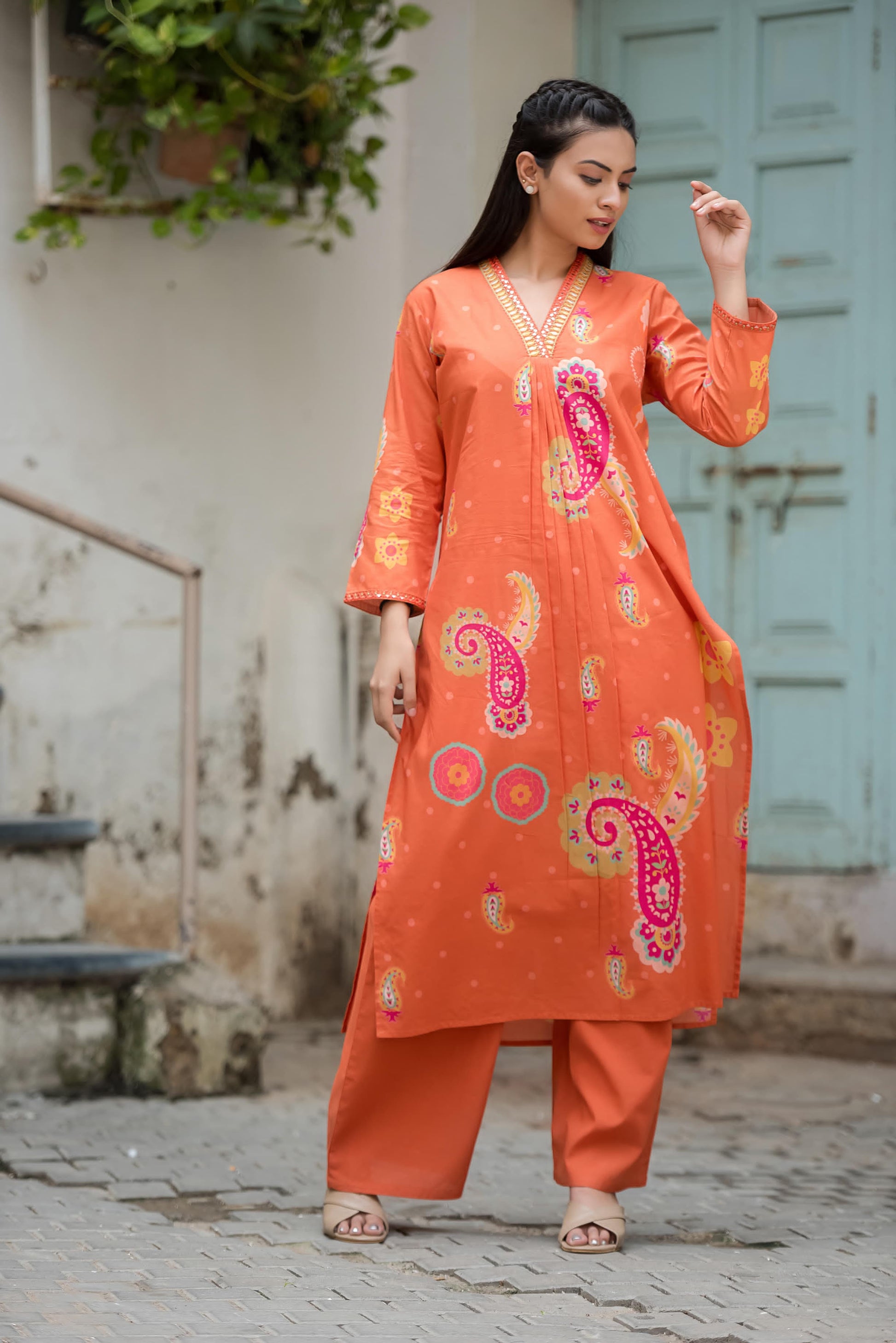 Colour: Warm rust orange with vibrant multi-colour paisley prints in hot pink, yellow, and ivory – radiating cheerful charm.
