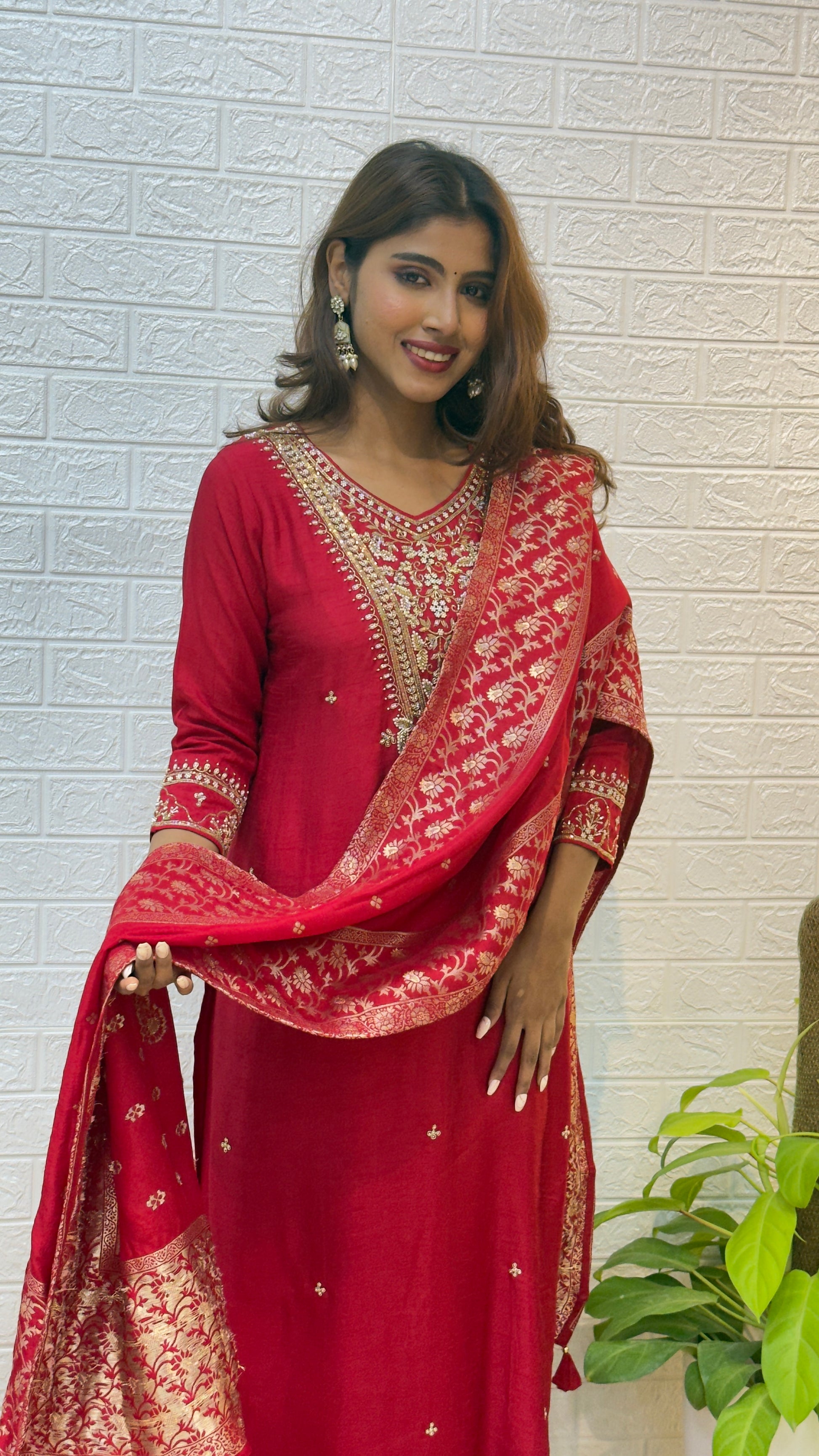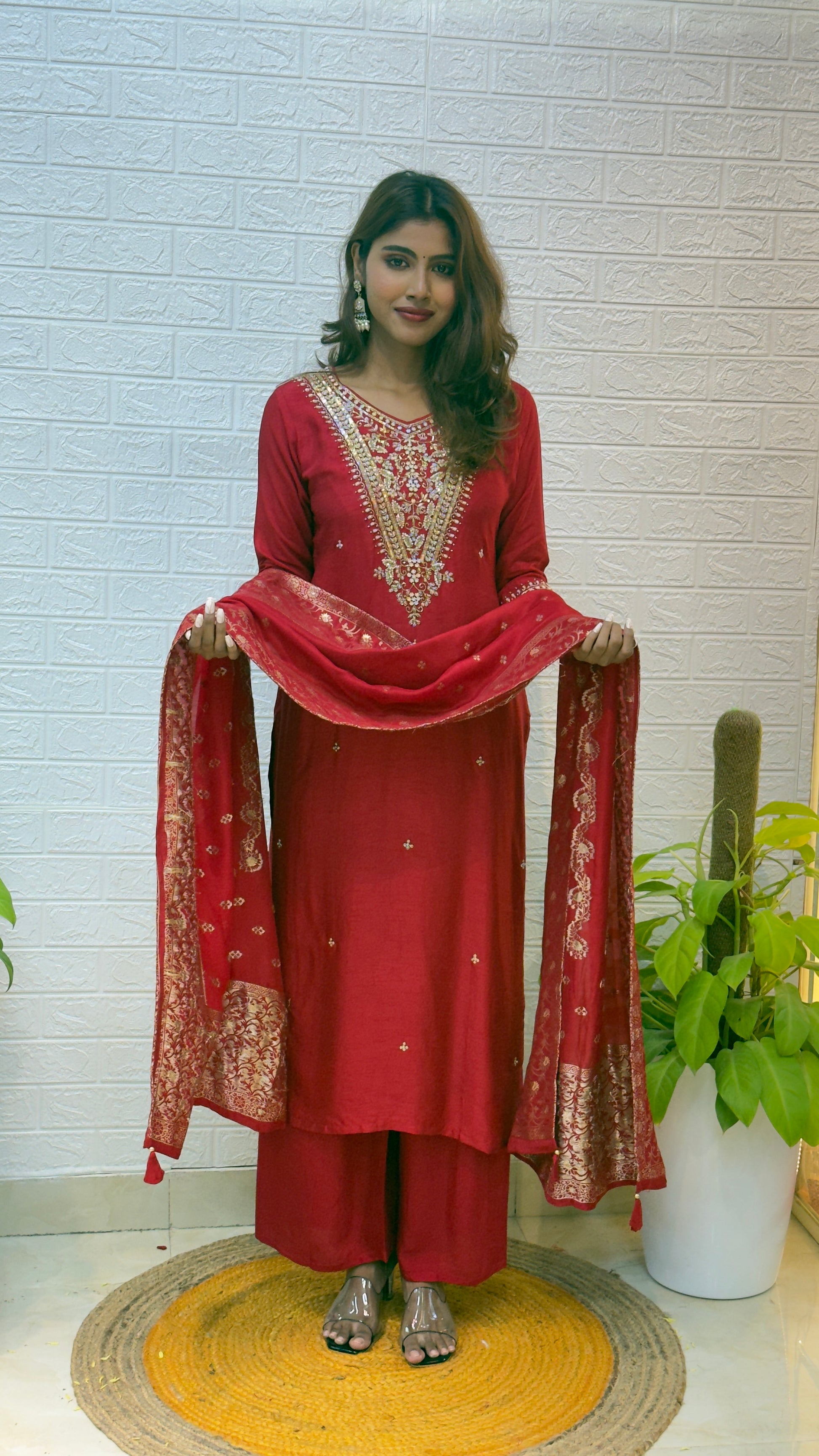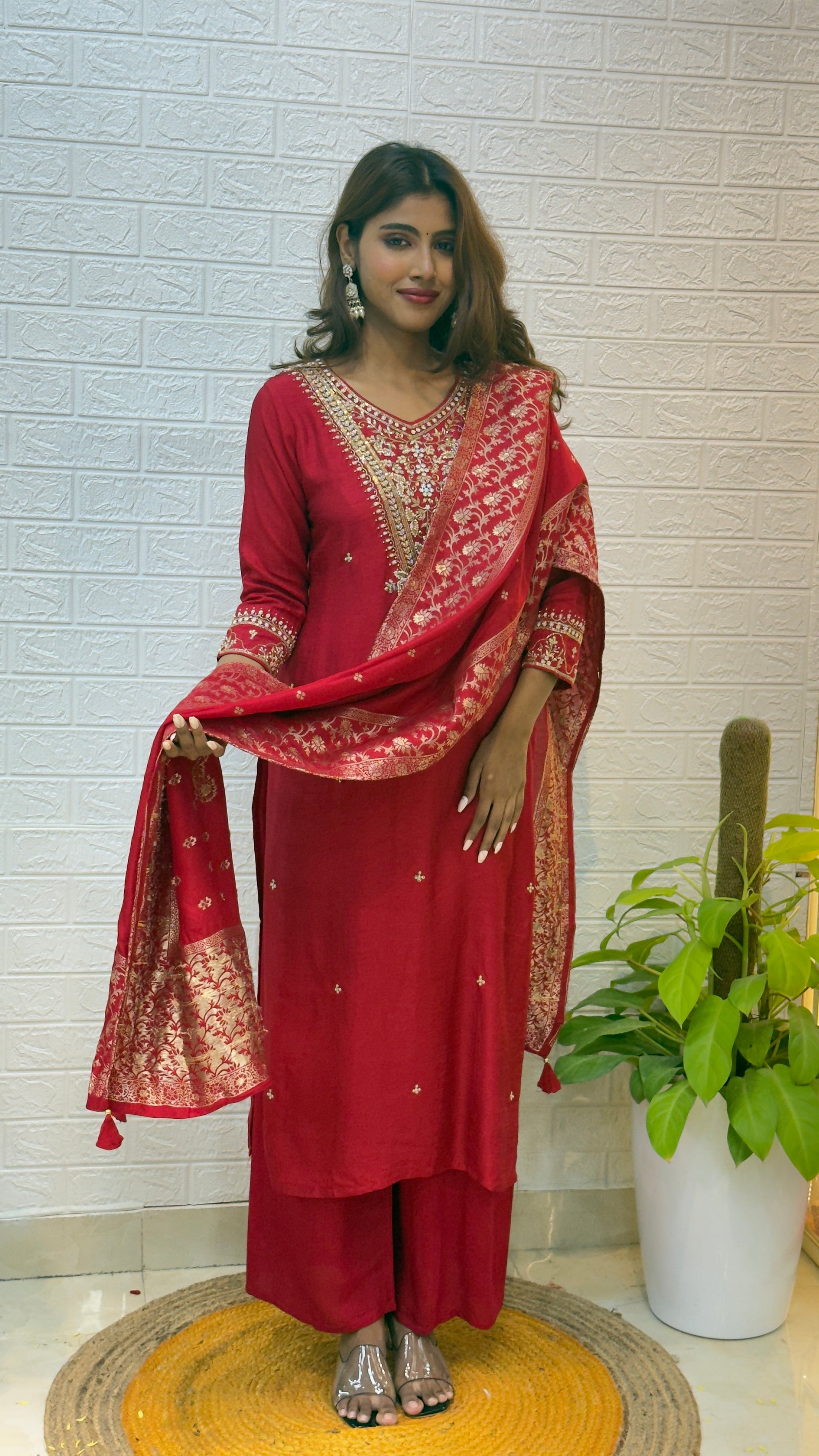 The deep Red tone paired with the shimmering Banarasi dupatta creates a perfect balance of vibrance and elegance. Lightweight yet grand, this outfit radiates festive joy and sophistication — ideal for weddings, family gatherings, and special occasions.