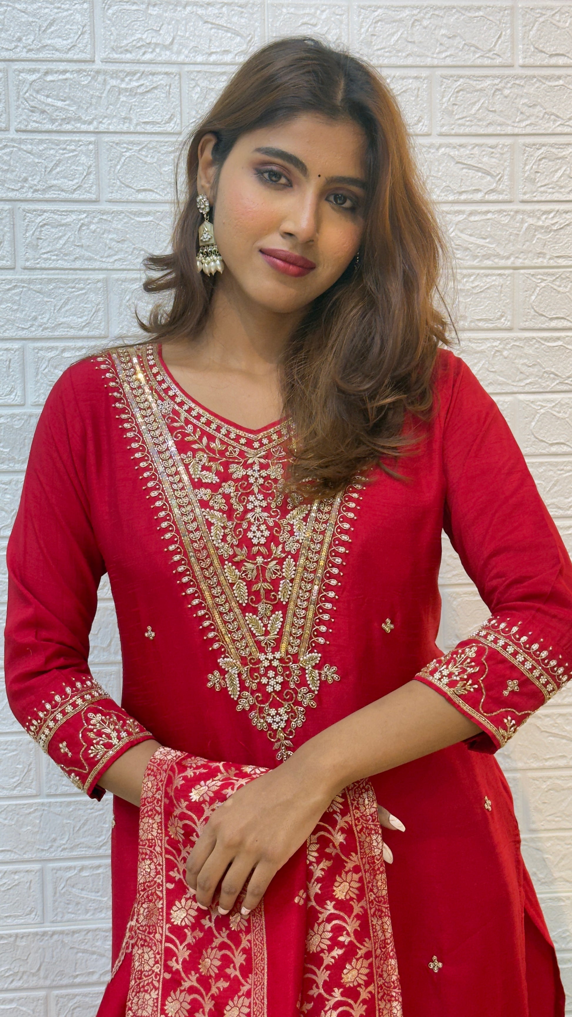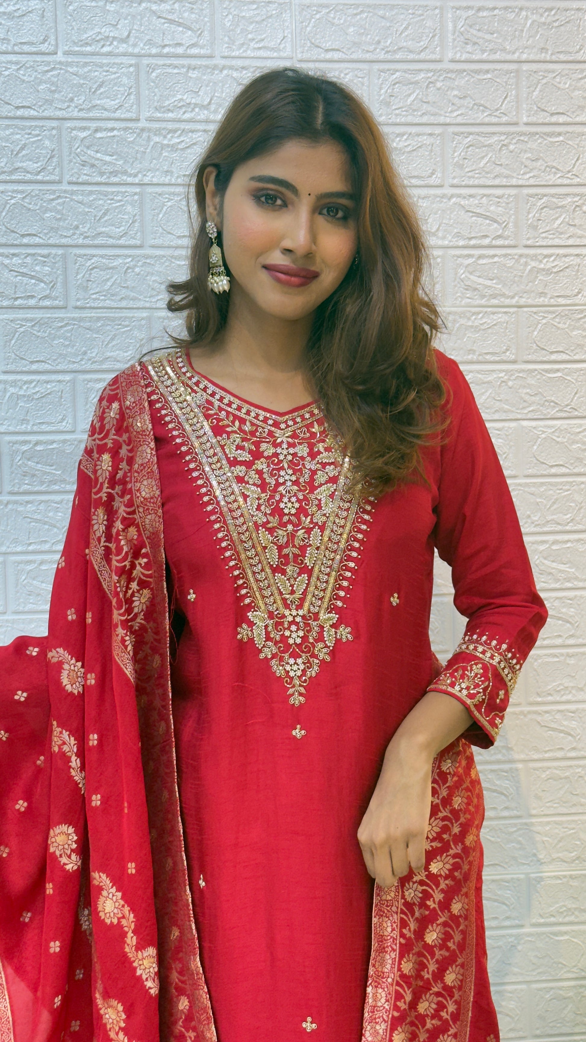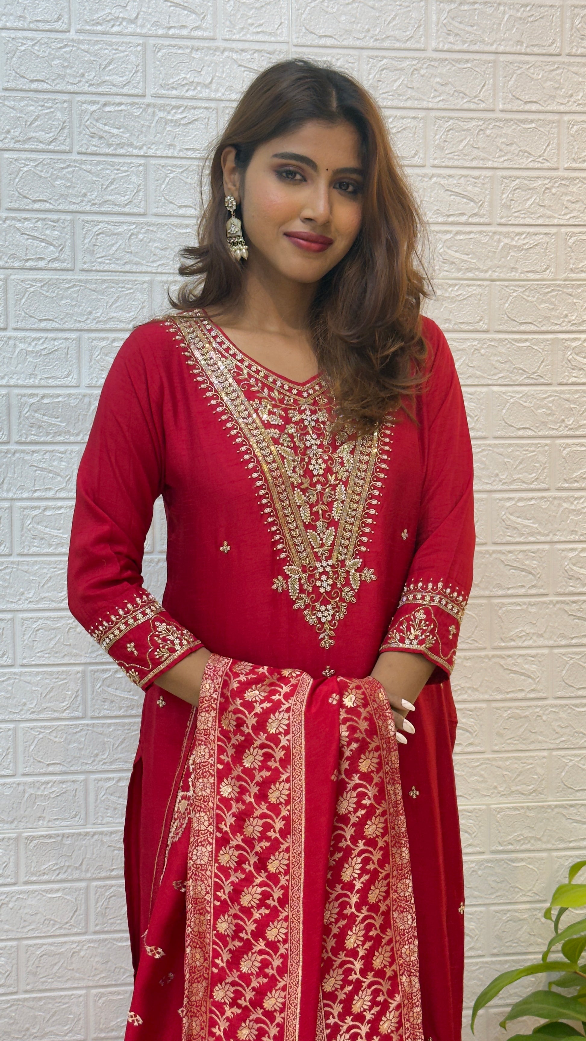 The deep Red tone paired with the shimmering Banarasi dupatta creates a perfect balance of vibrance and elegance. Lightweight yet grand, this outfit radiates festive joy and sophistication — ideal for weddings, family gatherings, and special occasions.