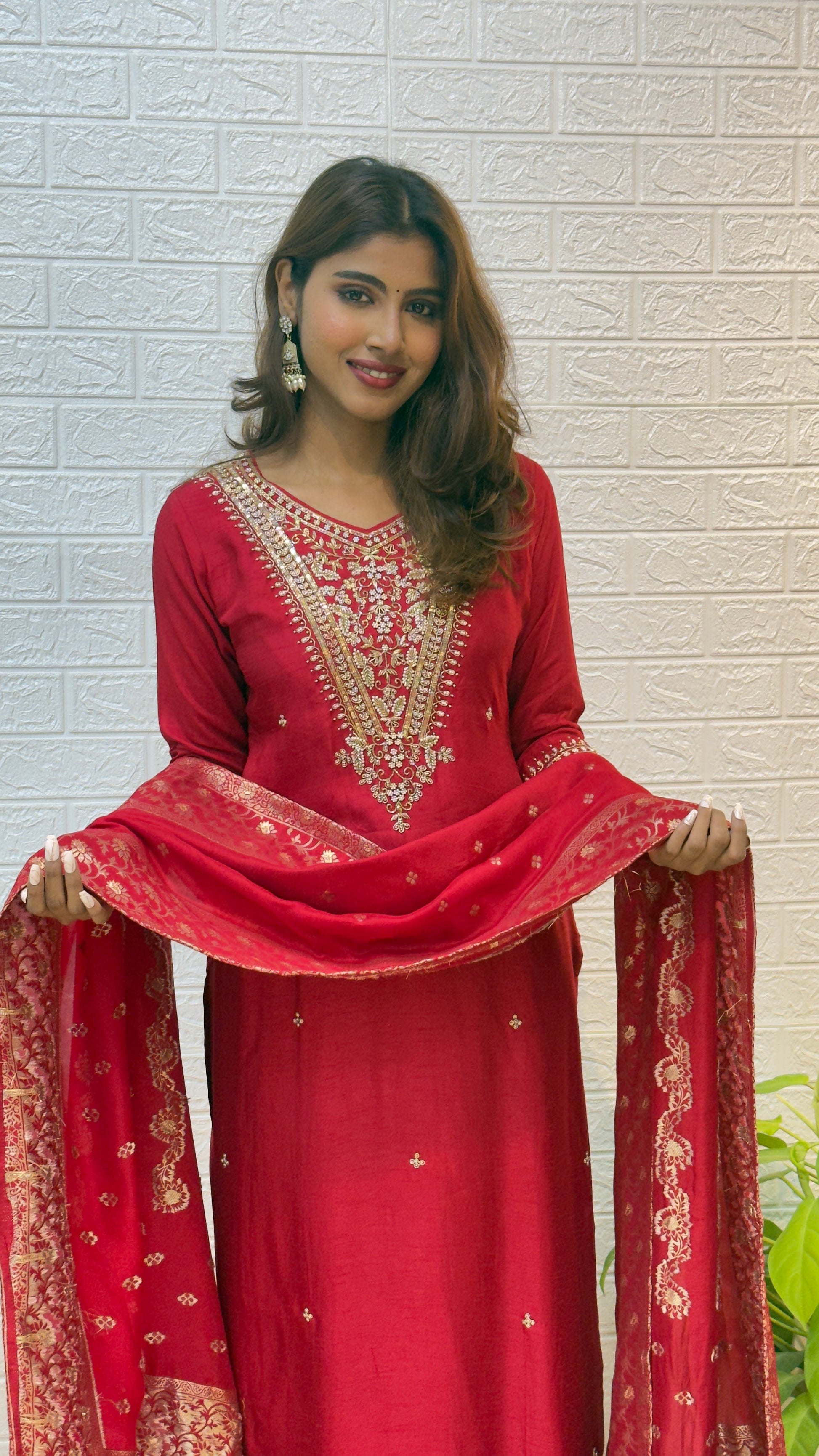 Celebrate the richness of tradition with this exquisite Dola Silk Suit in a radiant Red . The kurta features intricate hand-embroidered detailing around the neckline and sleeves, adding regal charm and sophistication. Paired with a Banarasi dupatta showcasing ornate zari motifs and a detailed border, this ensemble is designed to make a graceful festive statement.