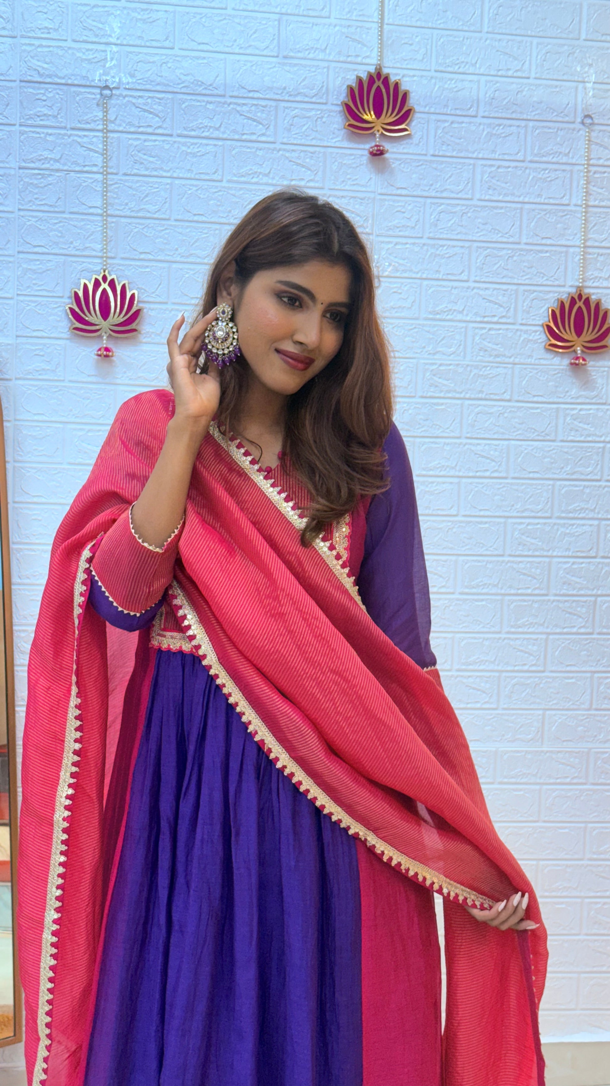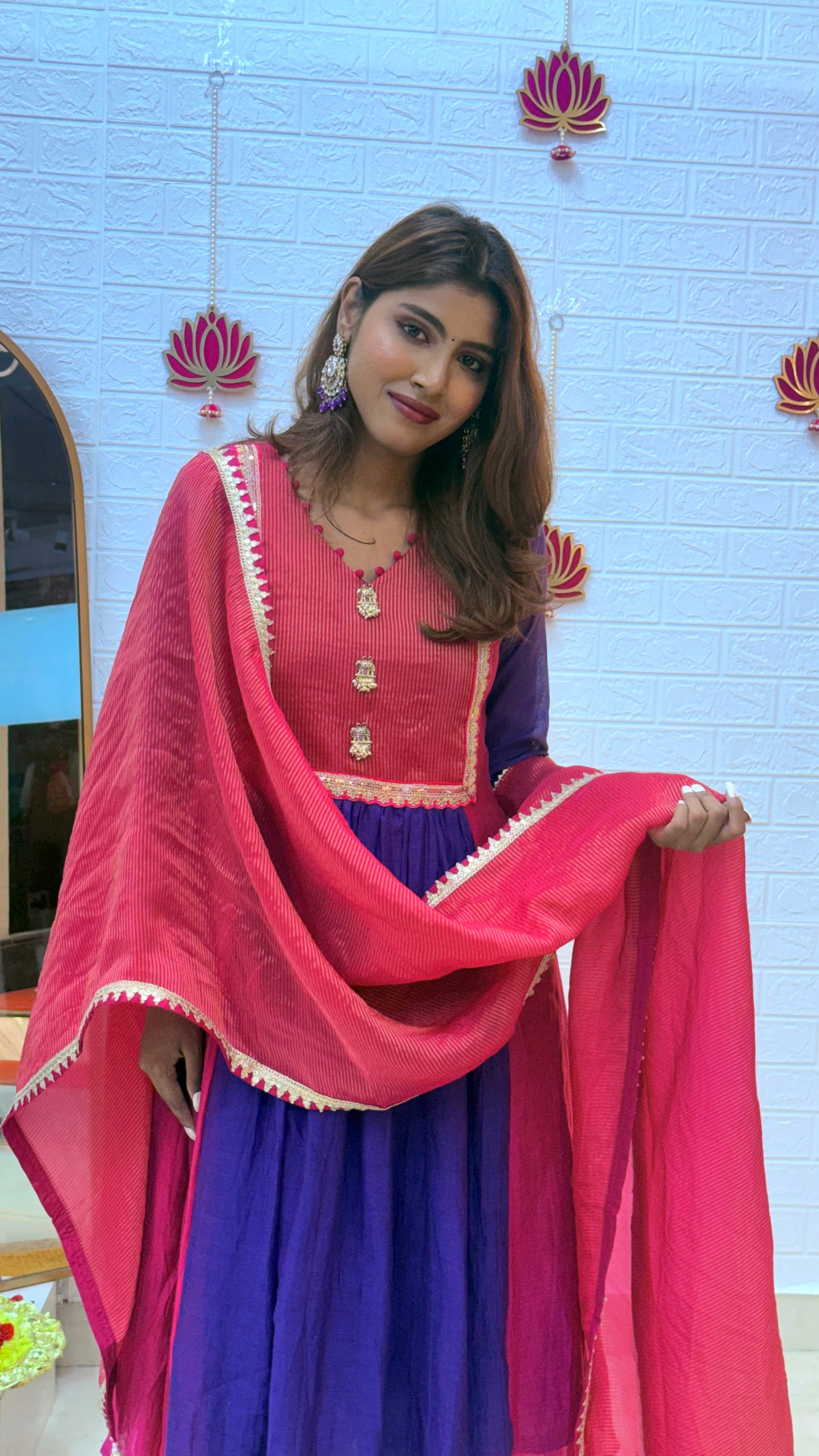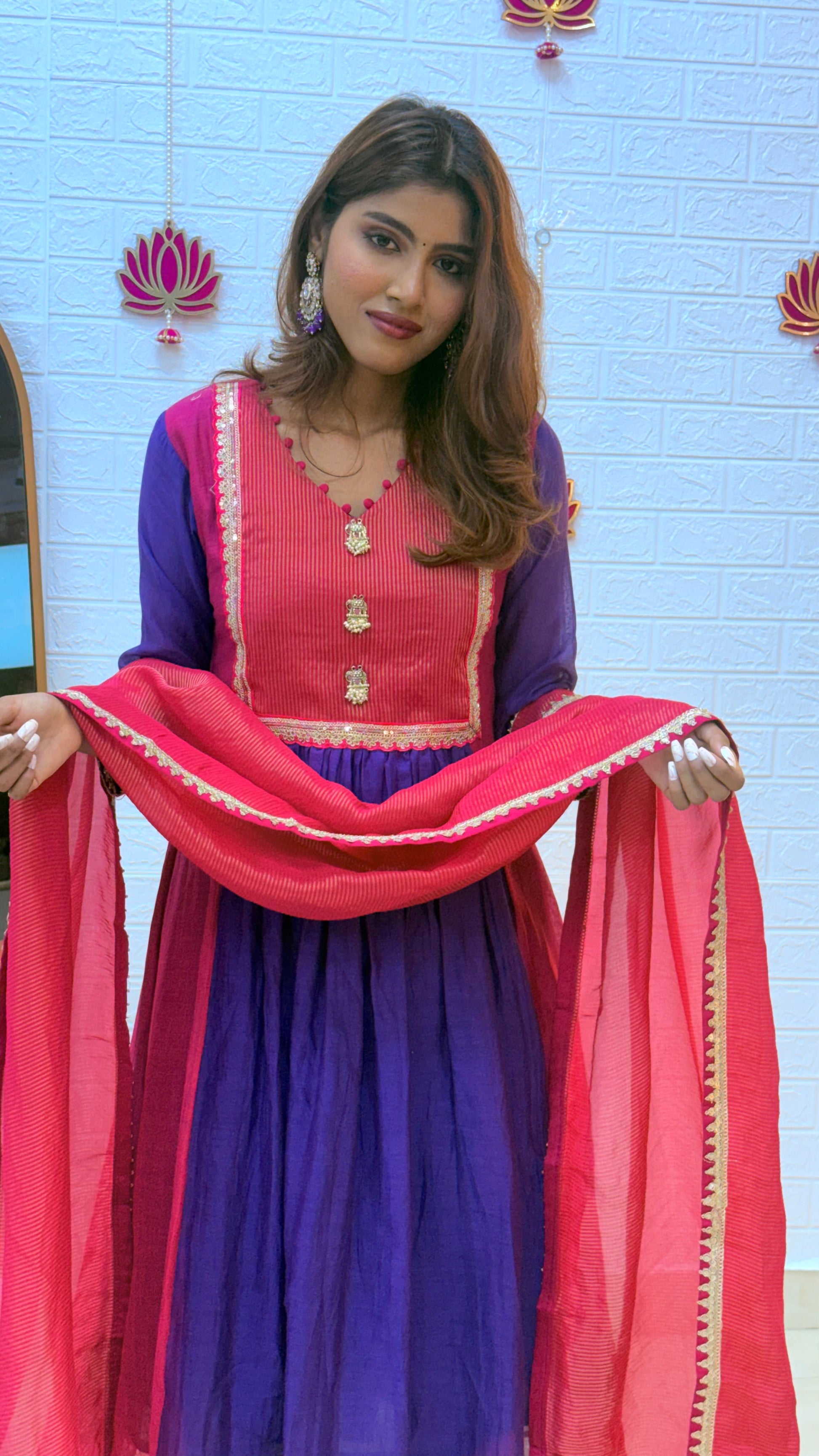 The radiant blend of pink and purple with a shimmering tissue dupatta makes this outfit effortlessly festive and timeless. Lightweight yet luxurious, it’s perfect for adding a touch of grace and sophistication to your special celebrations.
