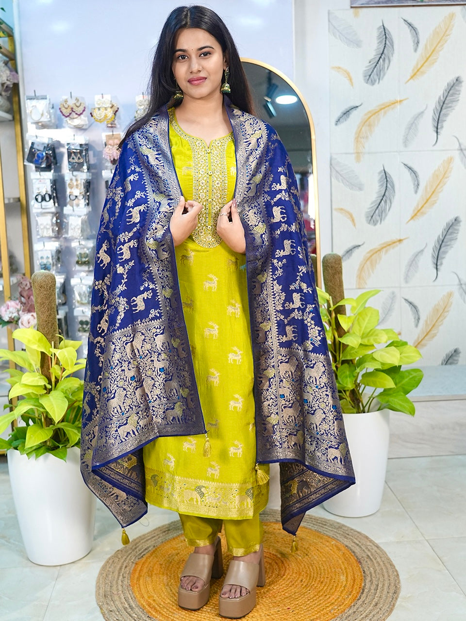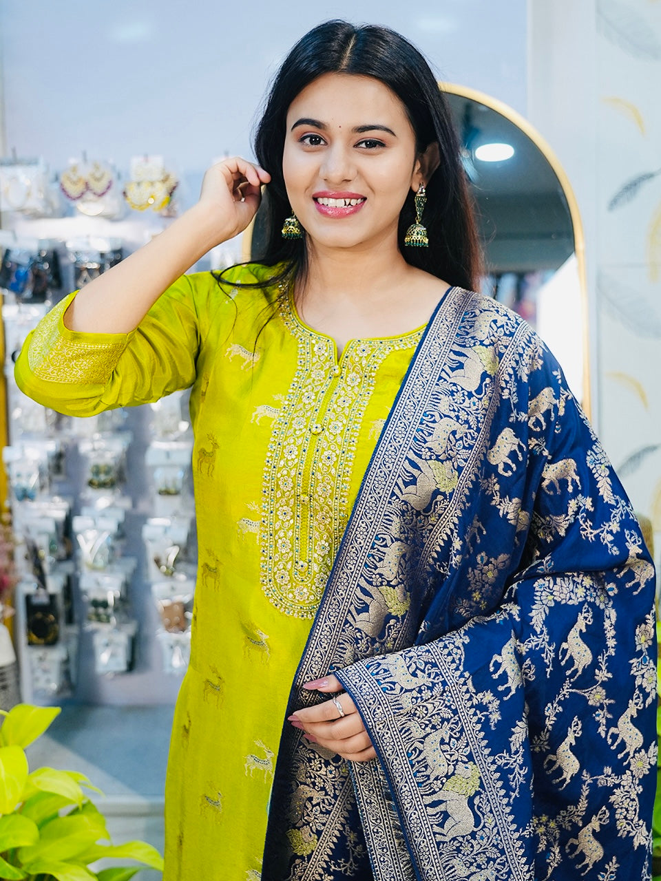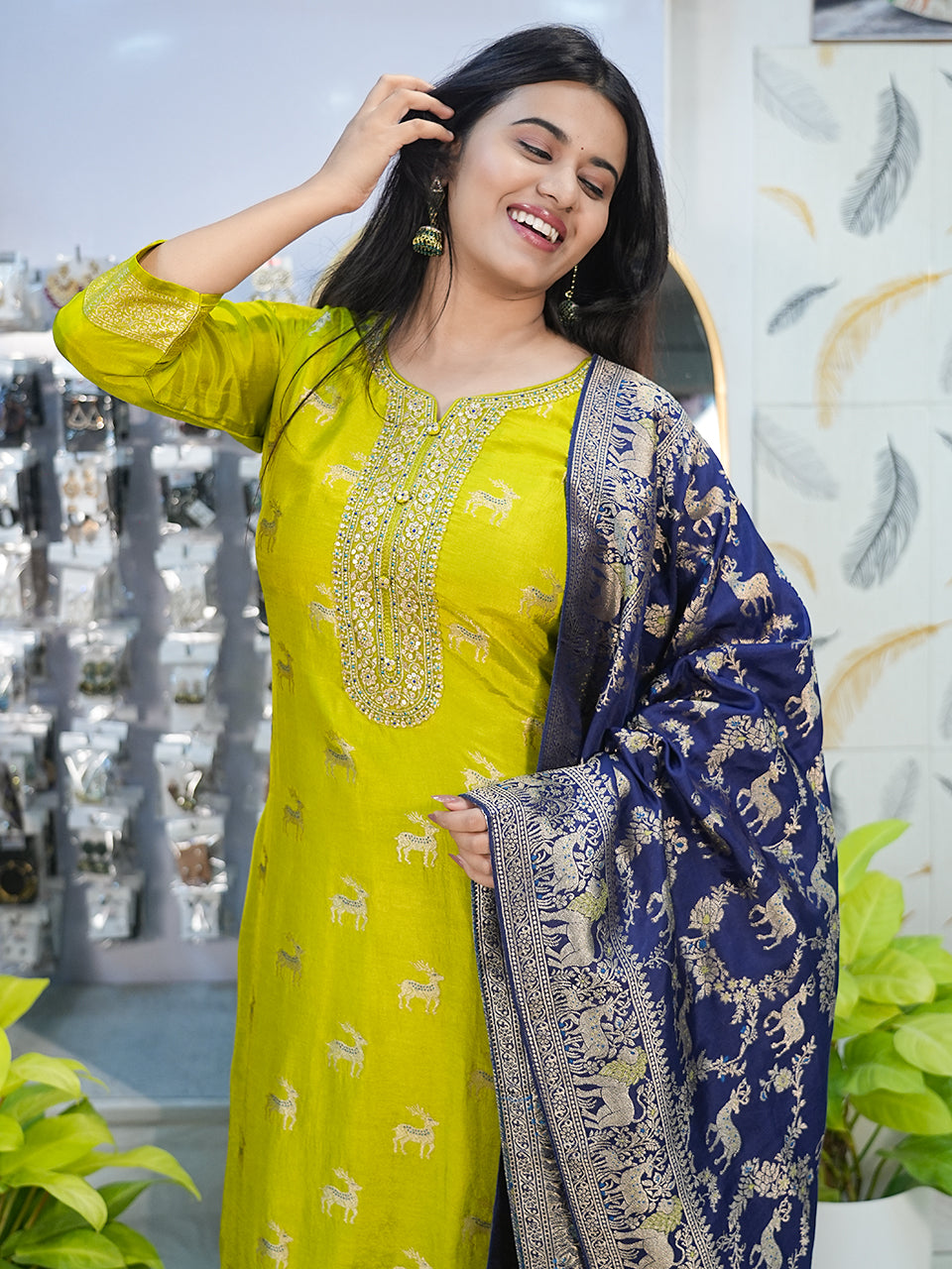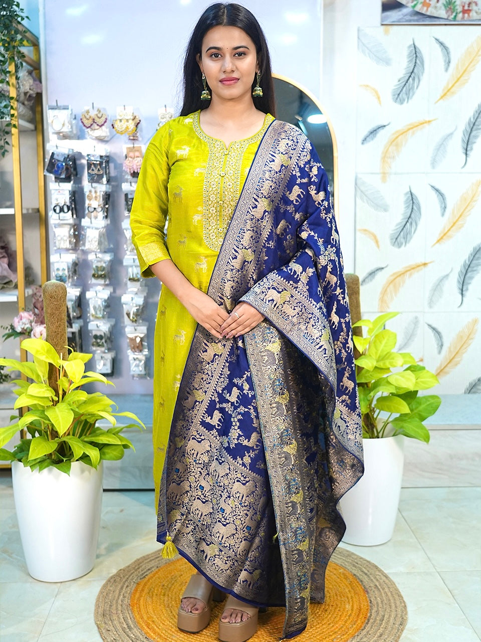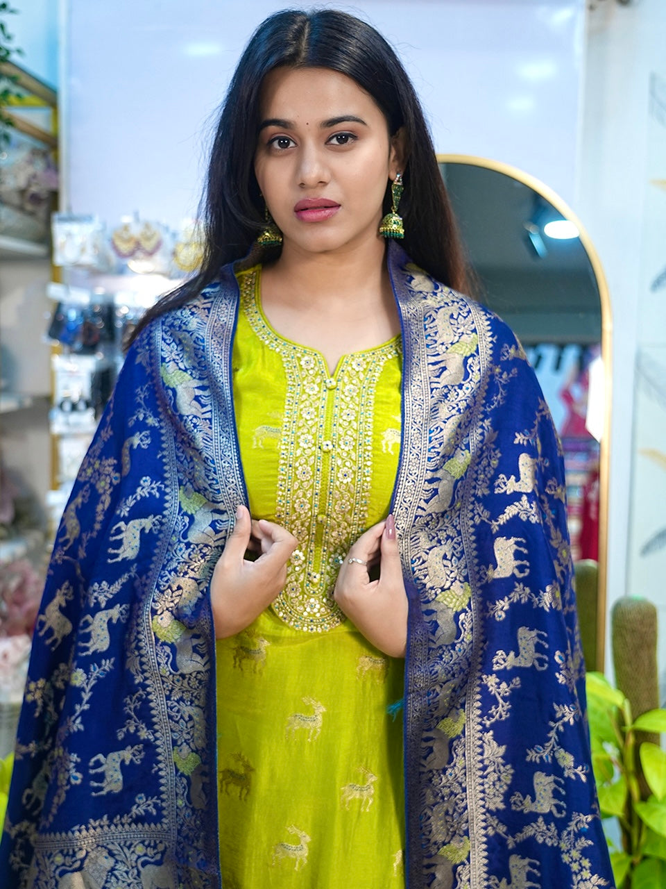 Tradition meets statement style in this olive green Banarasi silk suit, gracefully adorned with zari motifs featuring animal-themed artistry. The neckline is embellished with intricate embroidery and mirror accents, adding a touch of regal elegance. The highlight is the majestic royal blue Banarasi dupatta with heavy gold zari weaving – a rich play of heritage patterns perfect for festive and formal occasions.