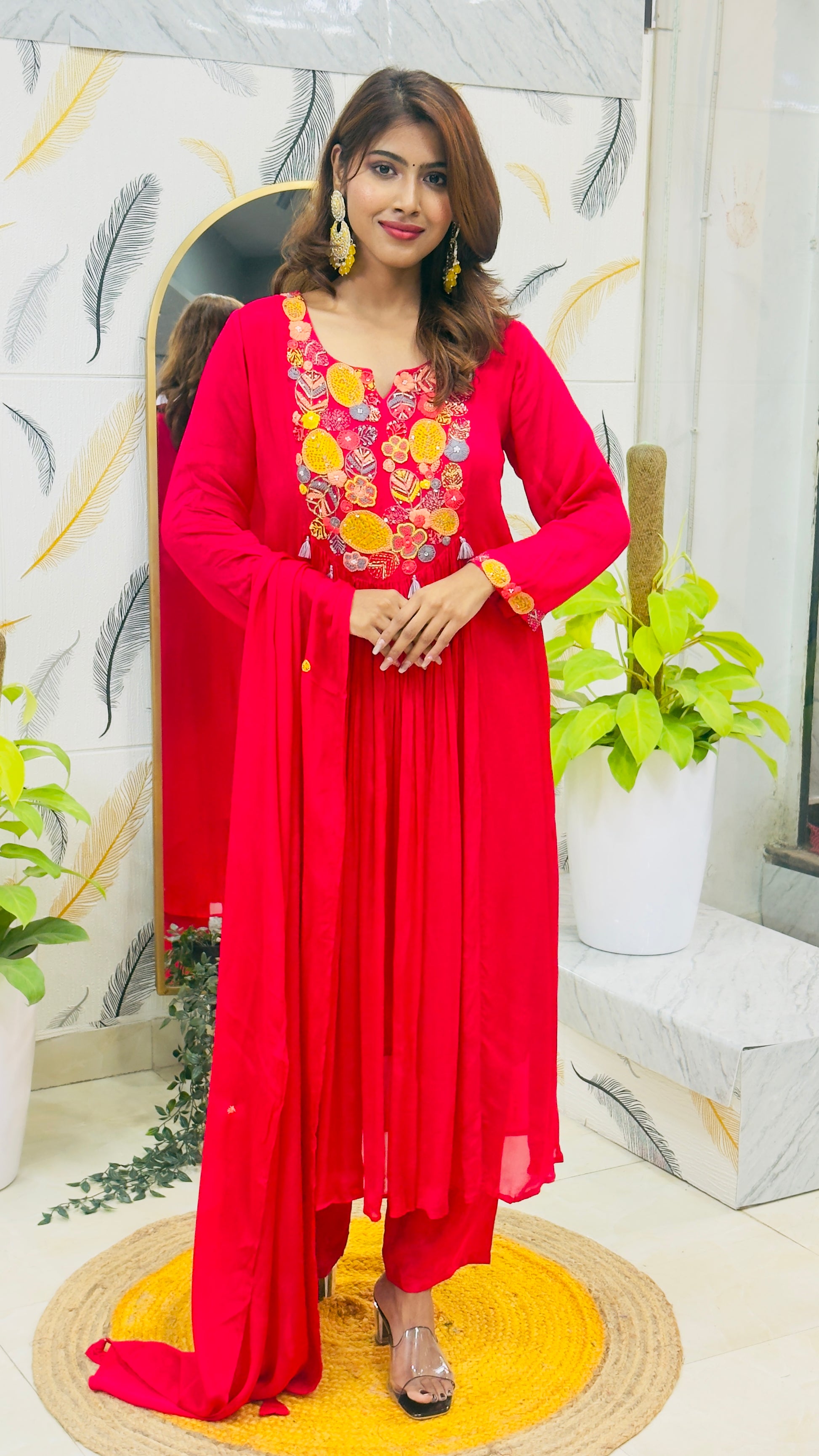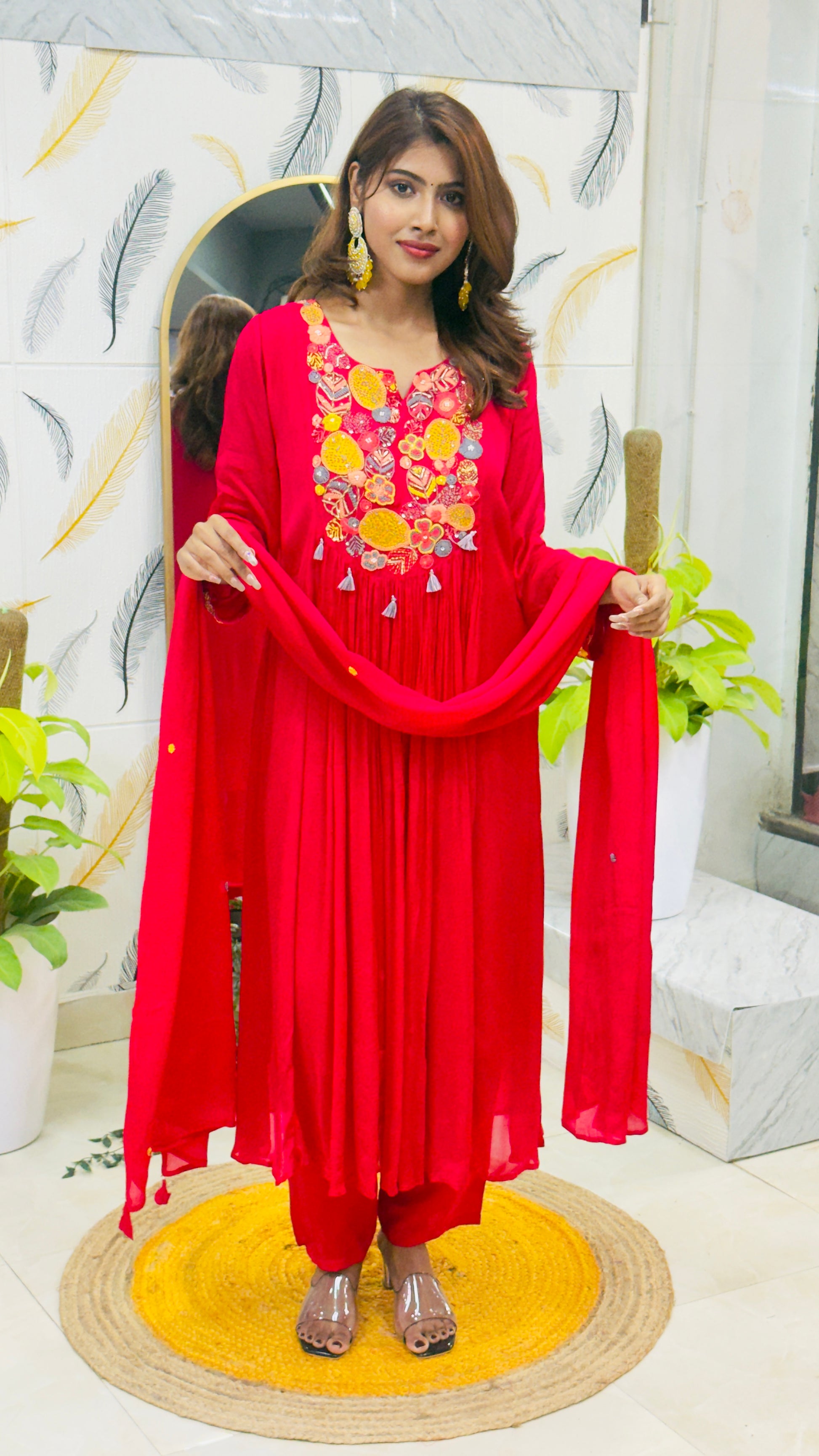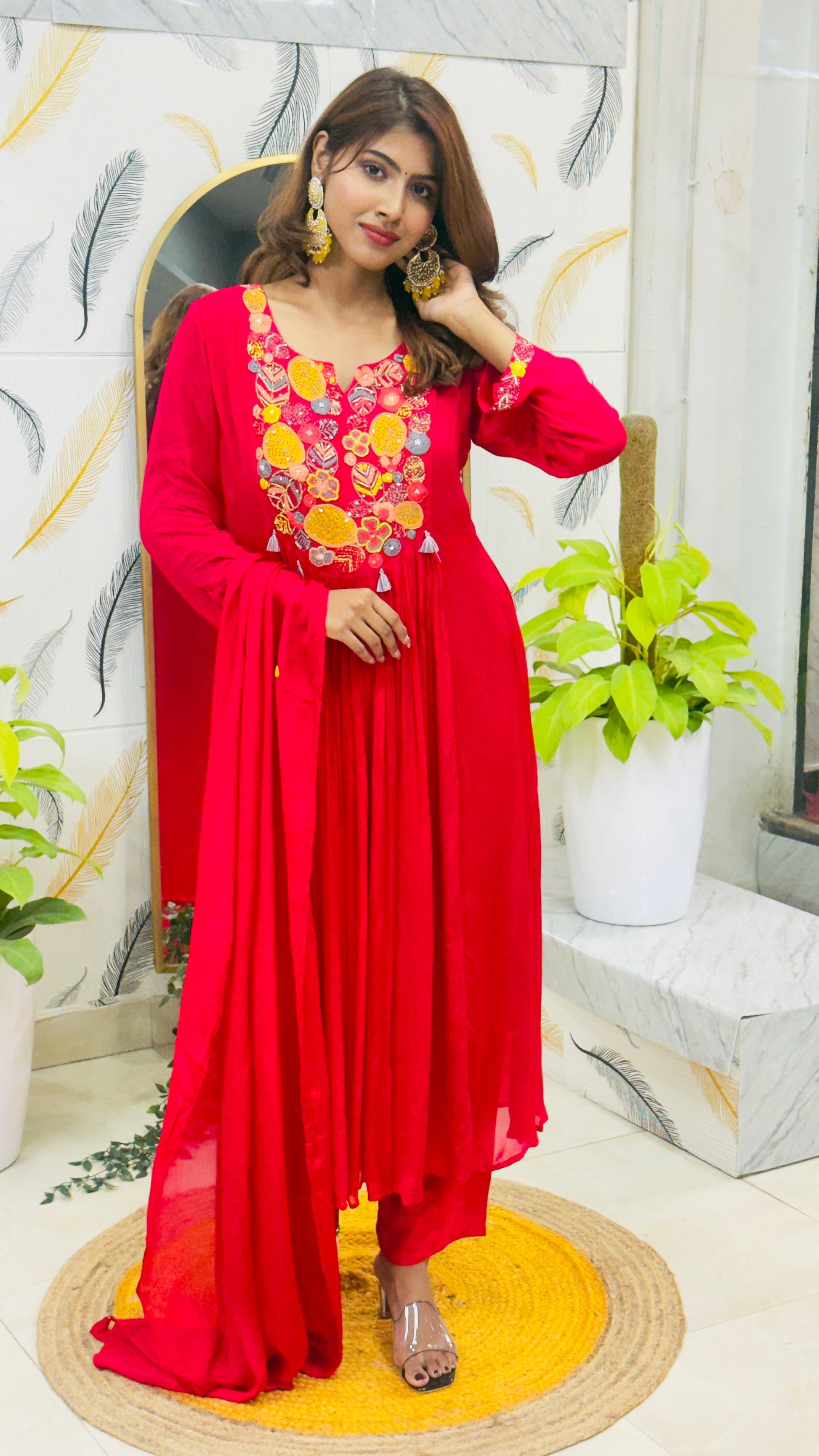 Turn heads this season with our Premium Pink Chinon Suit, designed in luxurious Chinon fabric that drapes beautifully and adds a soft sheen to your look. The kurta features  thread embroidery on the neckline and yoke, making it a showstopper for festive occasions and weddings. Paired with matching bottoms and a lightweight dupatta, this set offers comfort without compromising on elegance.