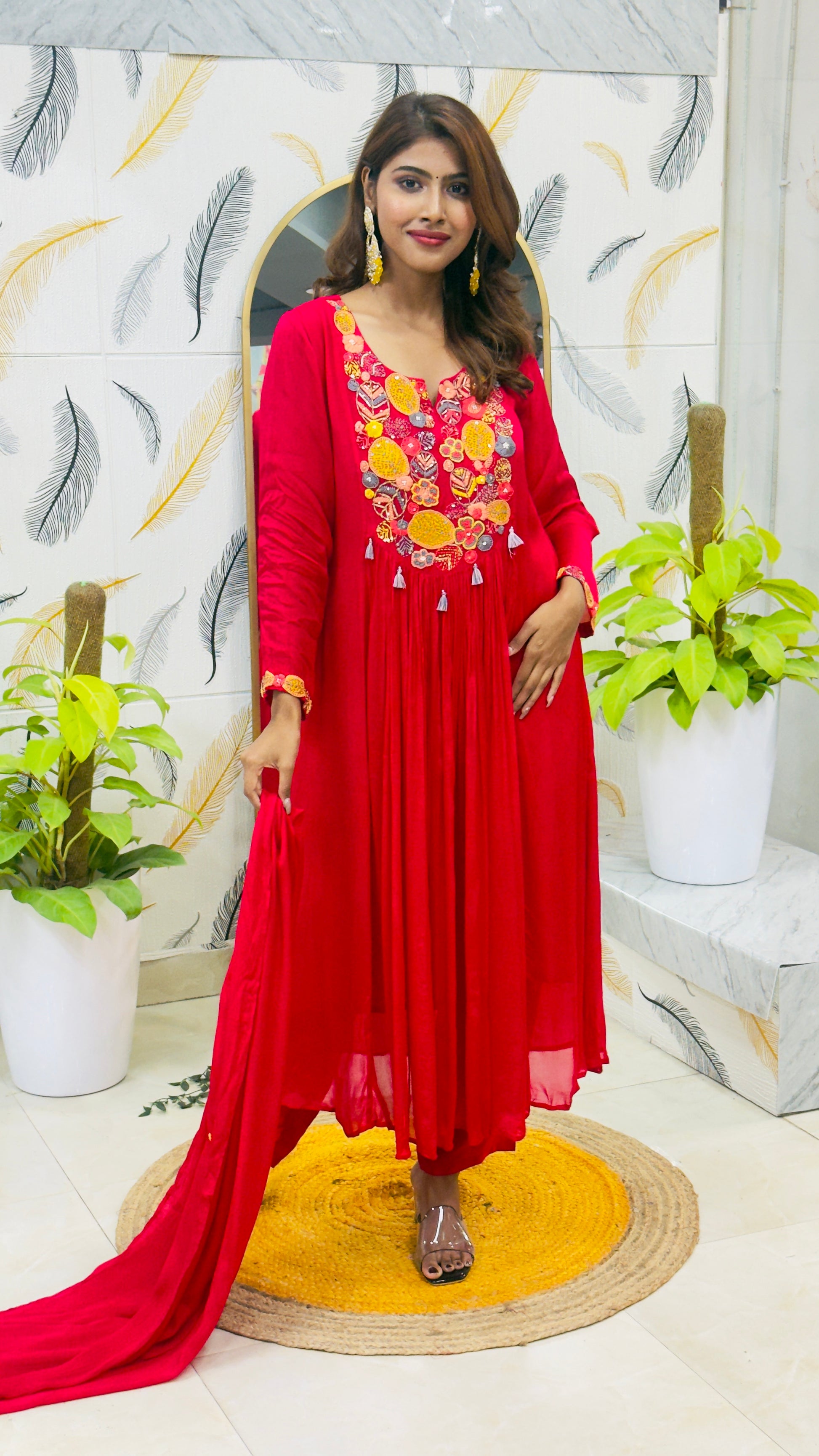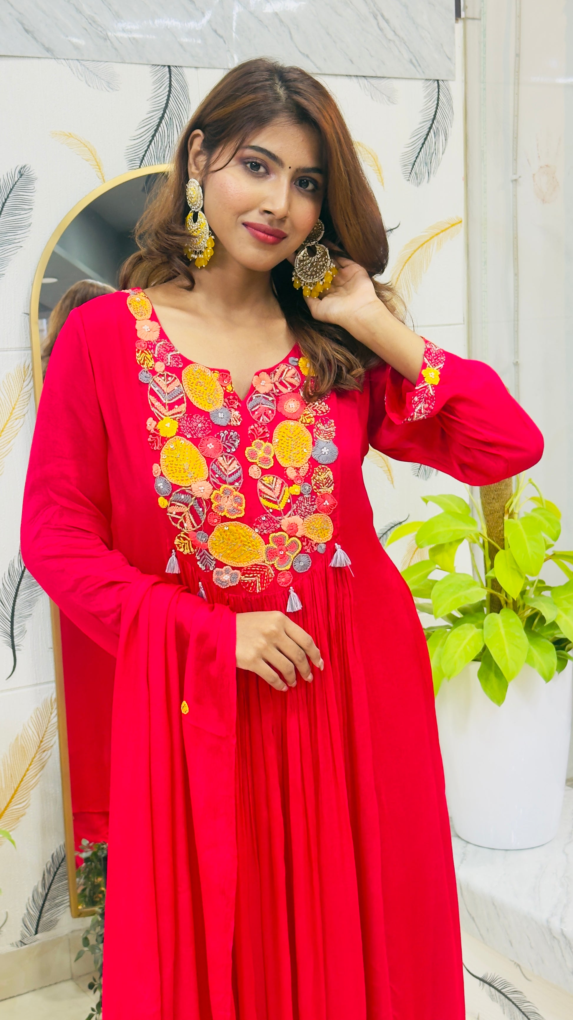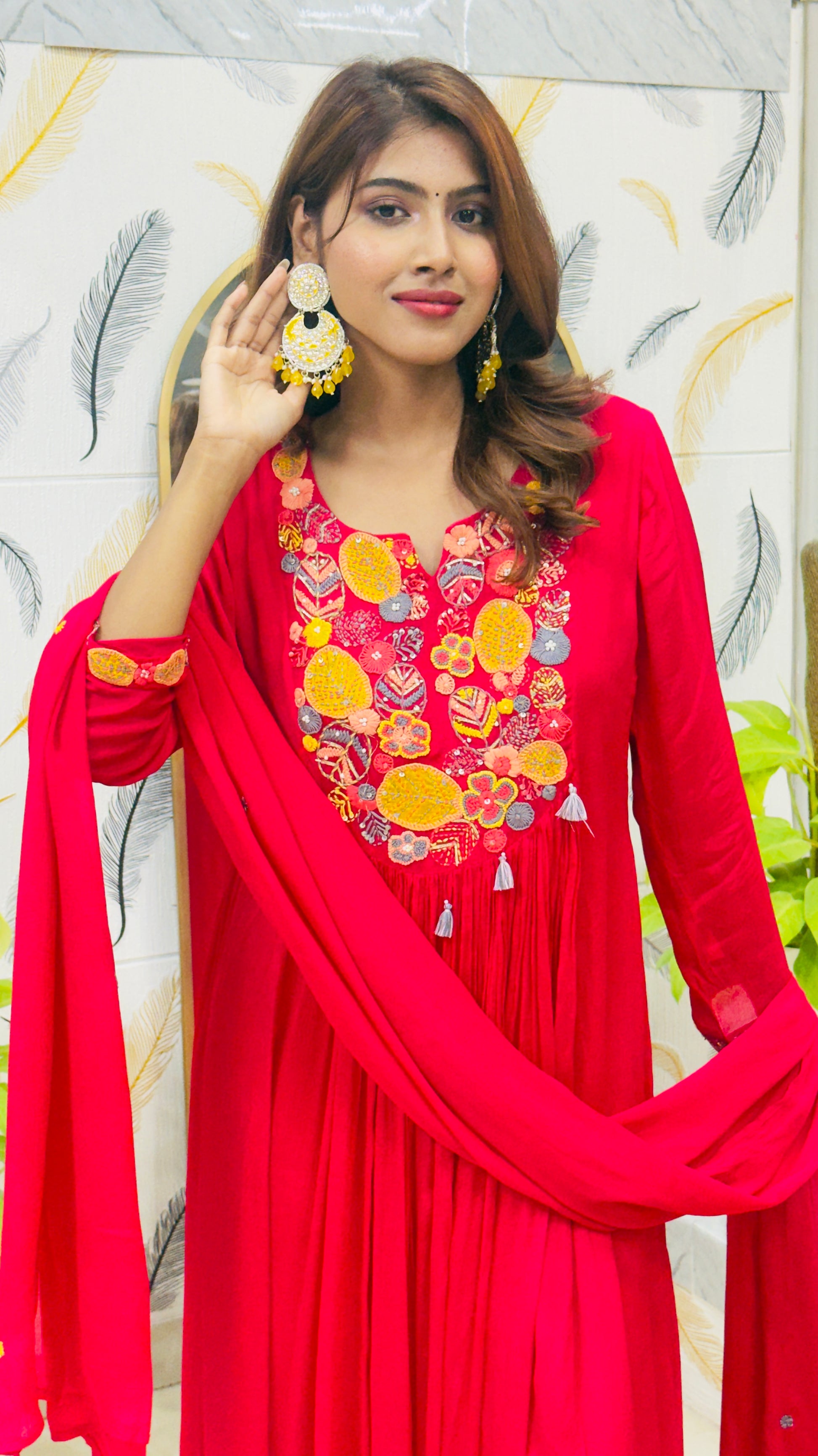 Turn heads this season with our Premium Pink Chinon Suit, designed in luxurious Chinon fabric that drapes beautifully and adds a soft sheen to your look. The kurta features  thread embroidery on the neckline and yoke, making it a showstopper for festive occasions and weddings. Paired with matching bottoms and a lightweight dupatta, this set offers comfort without compromising on elegance.
