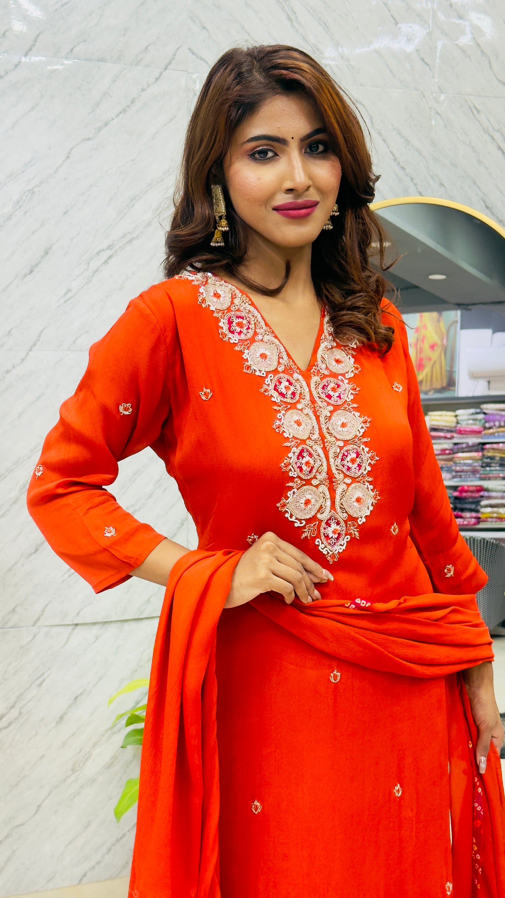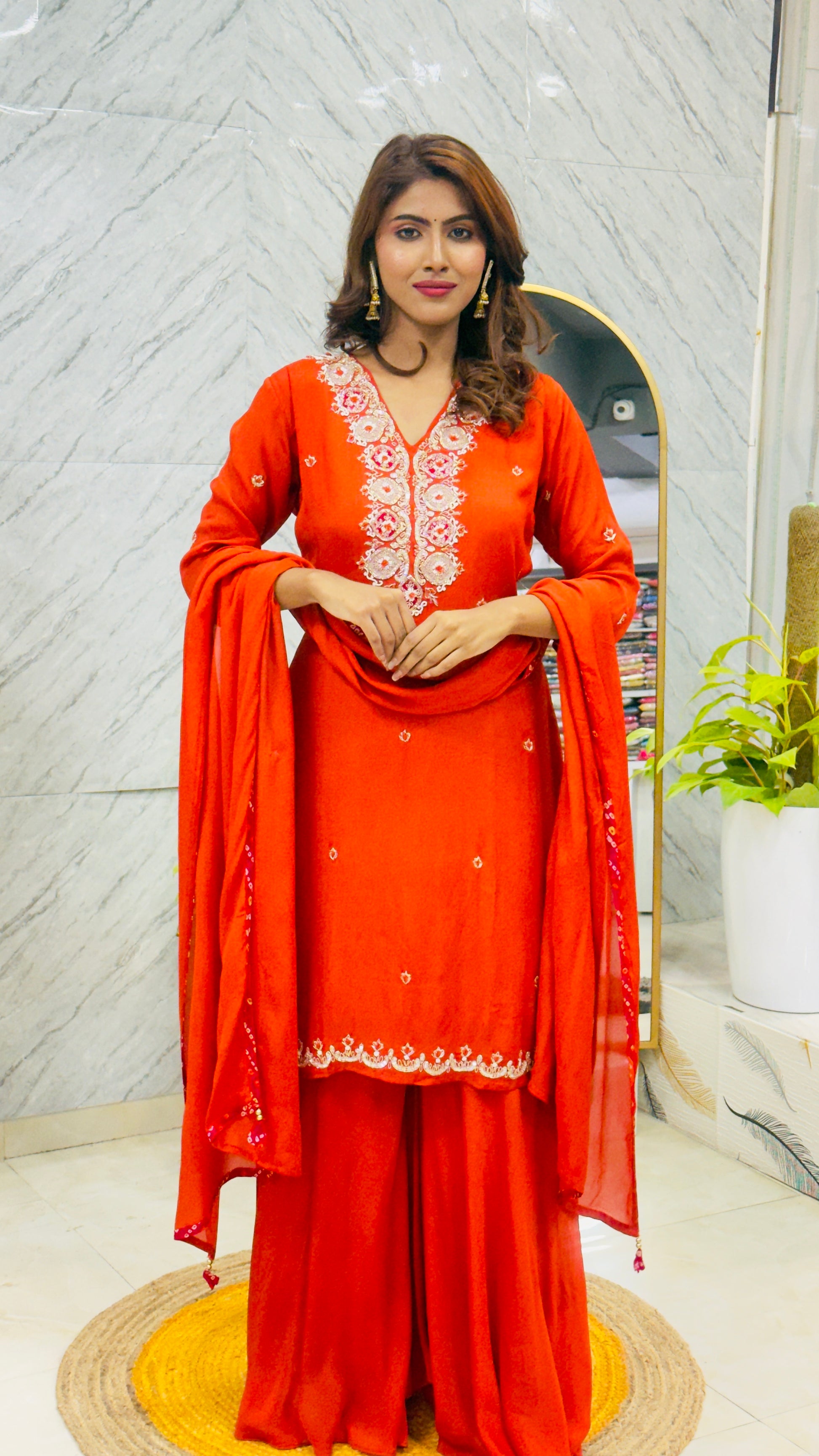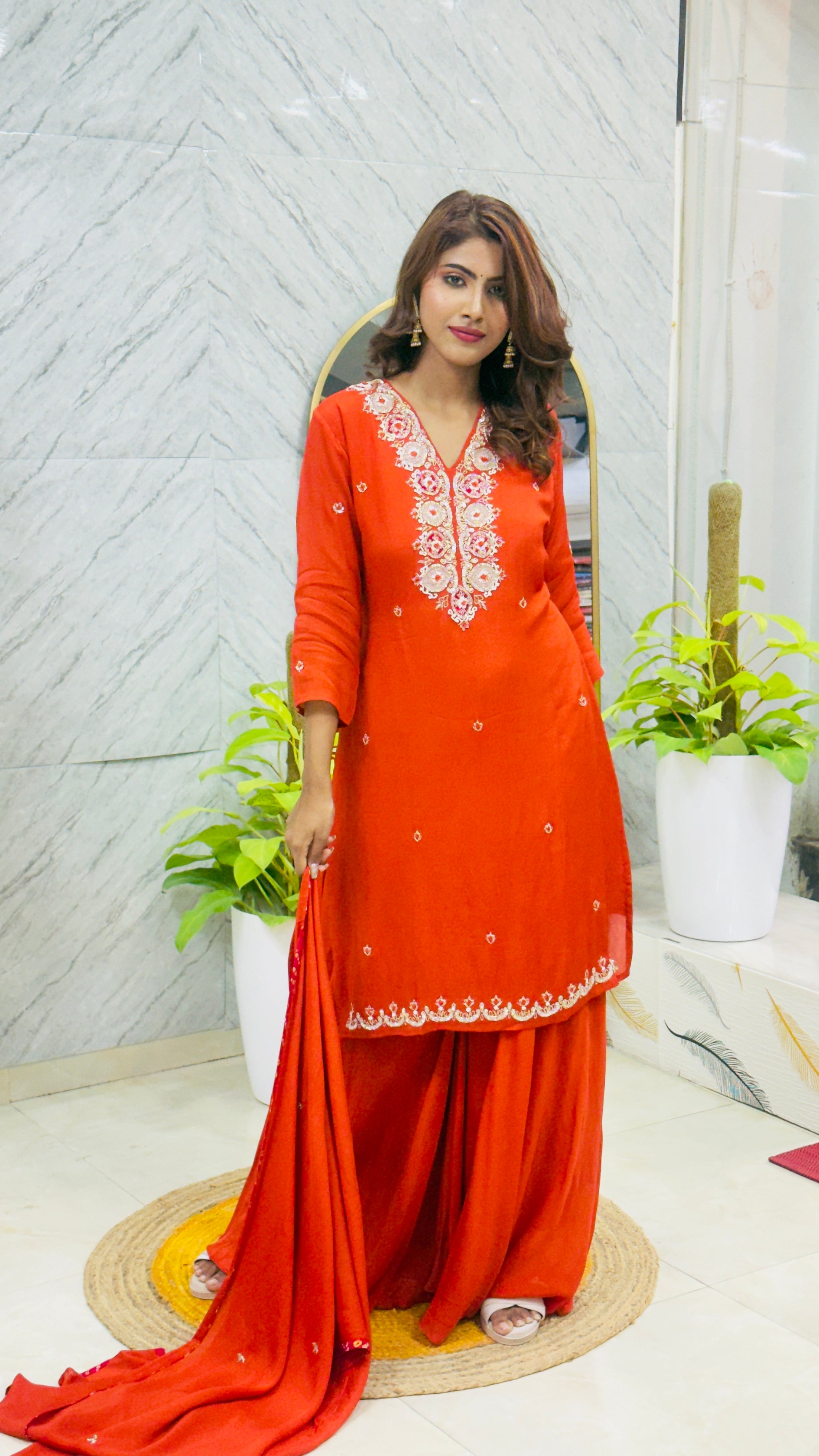 Make a bold festive statement with this Premium Georgette Palazzo Set in a vibrant orange shade. The kurta is adorned with delicate handwork embroidery, offering a touch of sophistication, while the flowy palazzo pants ensure both comfort and style. Paired with a lightweight chiffon dupatta, this ensemble is perfect for festive gatherings, weddings, and special occasions.