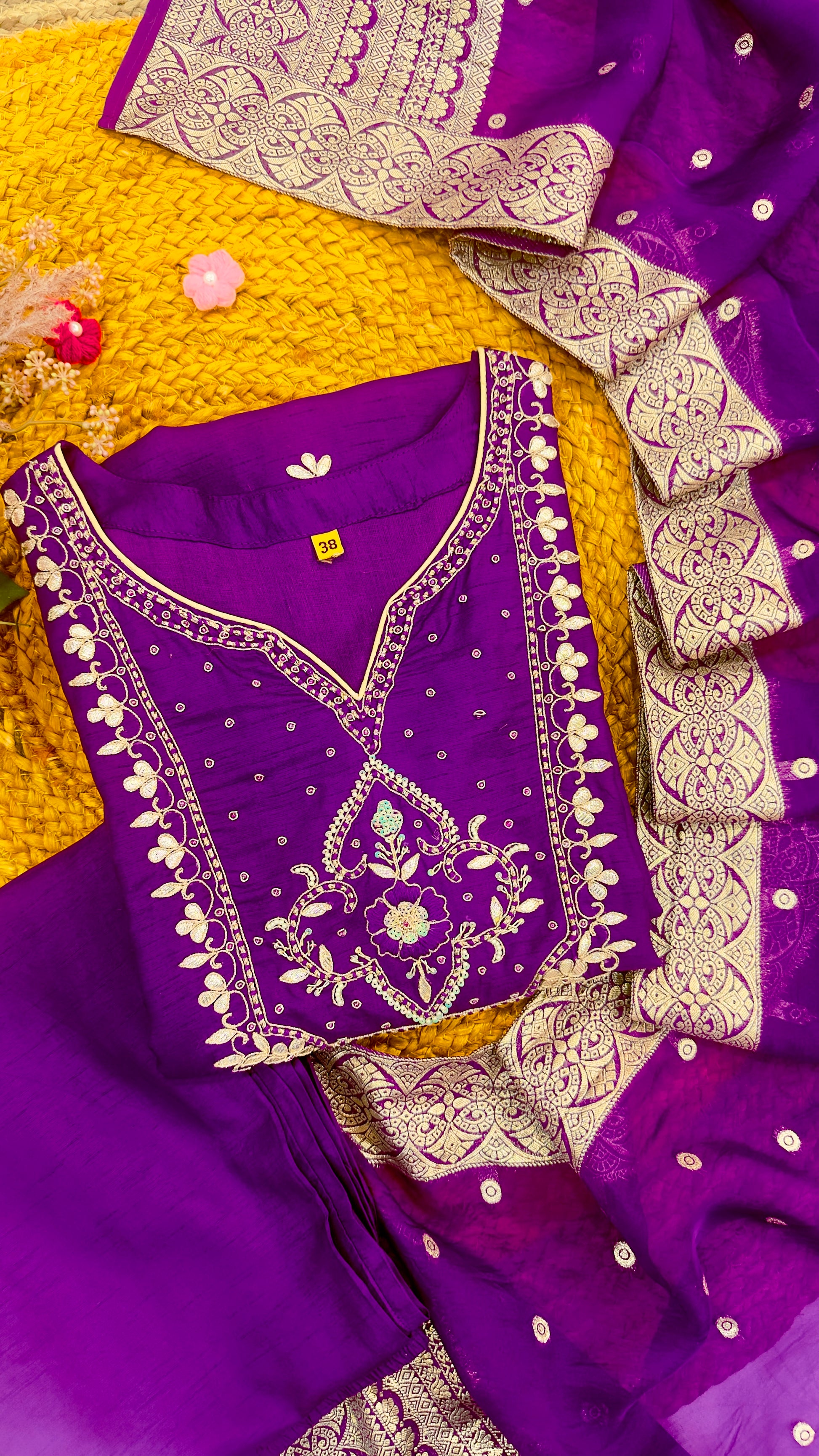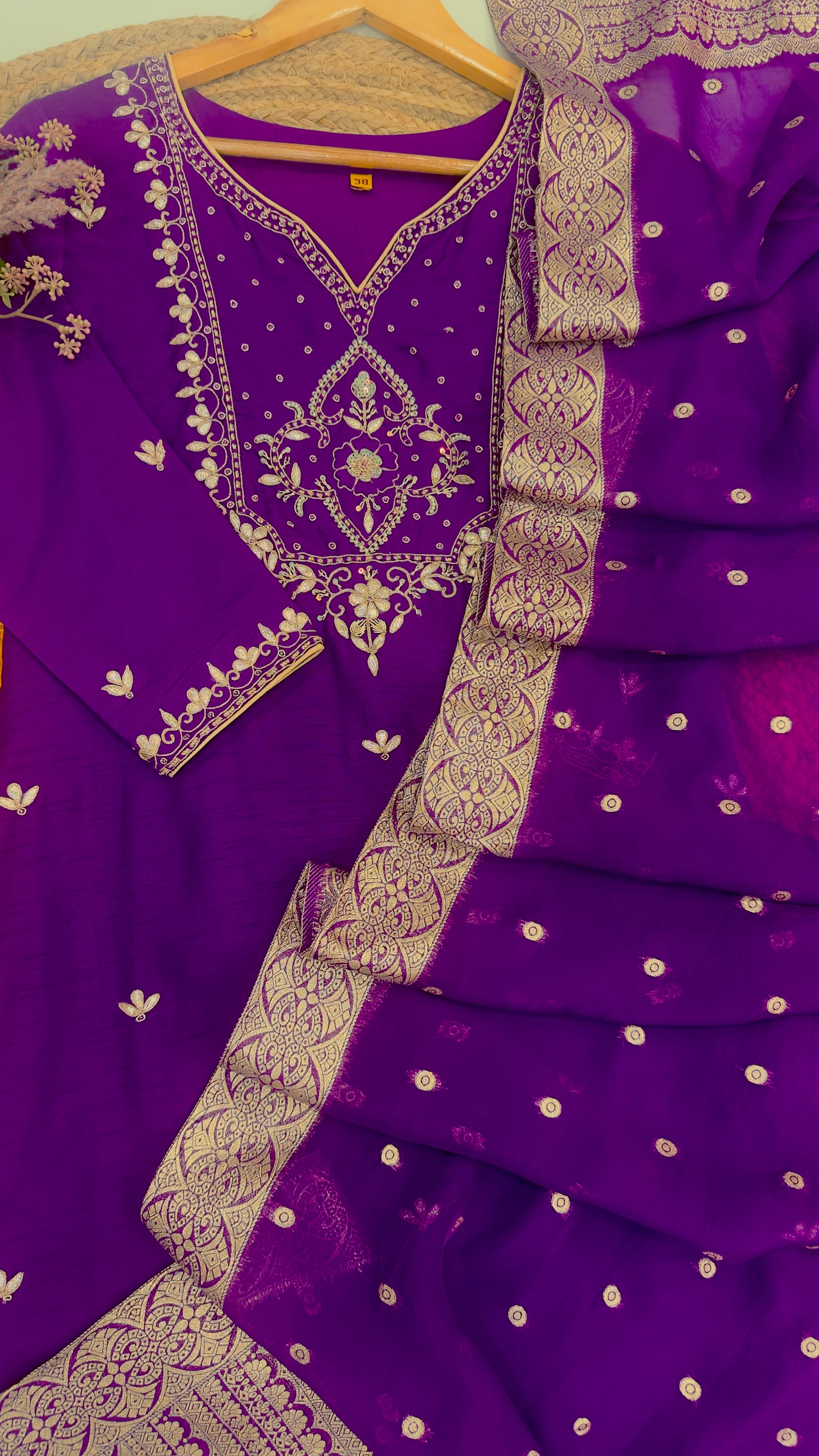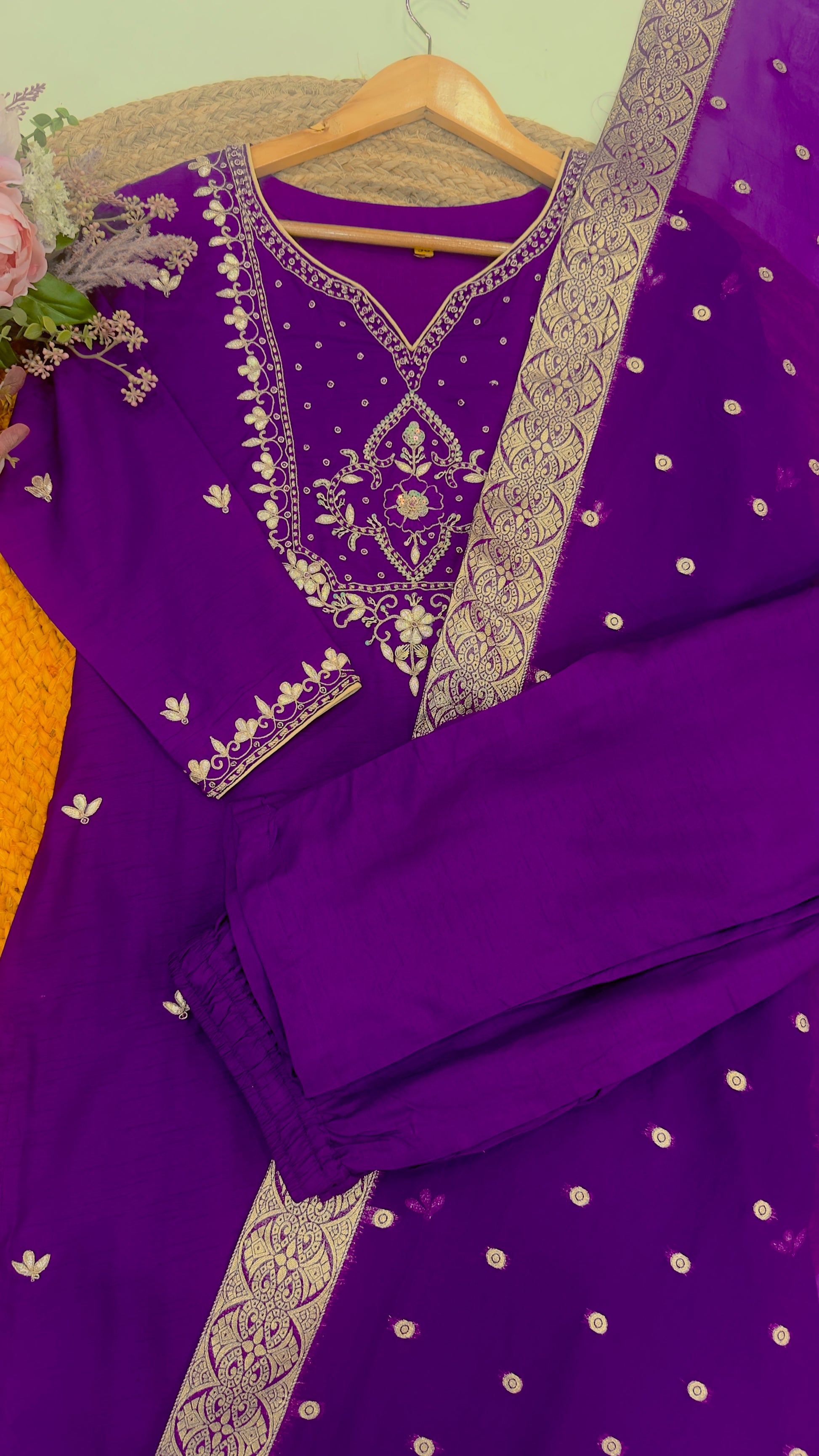 Drape yourself in understated royalty with this elegant purple Dola silk salwar suit. The neckline and sleeves are intricately hand-embroidered with floral-inspired motifs, radiating a regal charm. Paired with a zari-woven organza dupatta featuring a broad woven border and delicate buti work, this ensemble is perfect for festive occasions, cultural events, or elegant evening affairs.