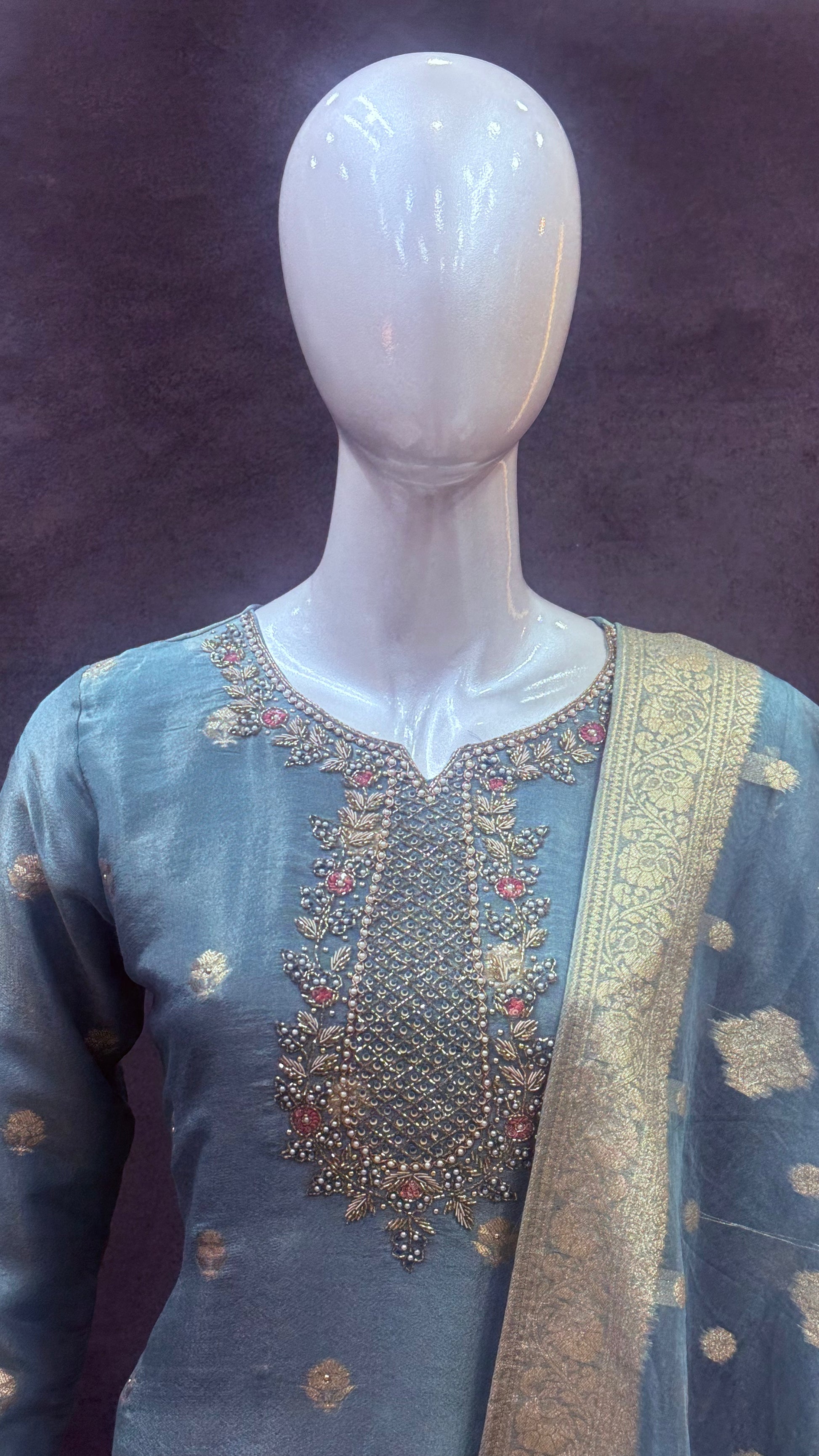 Blue Premium Tissue Silk Suit with Embellished Neckline & Organza Dupatta