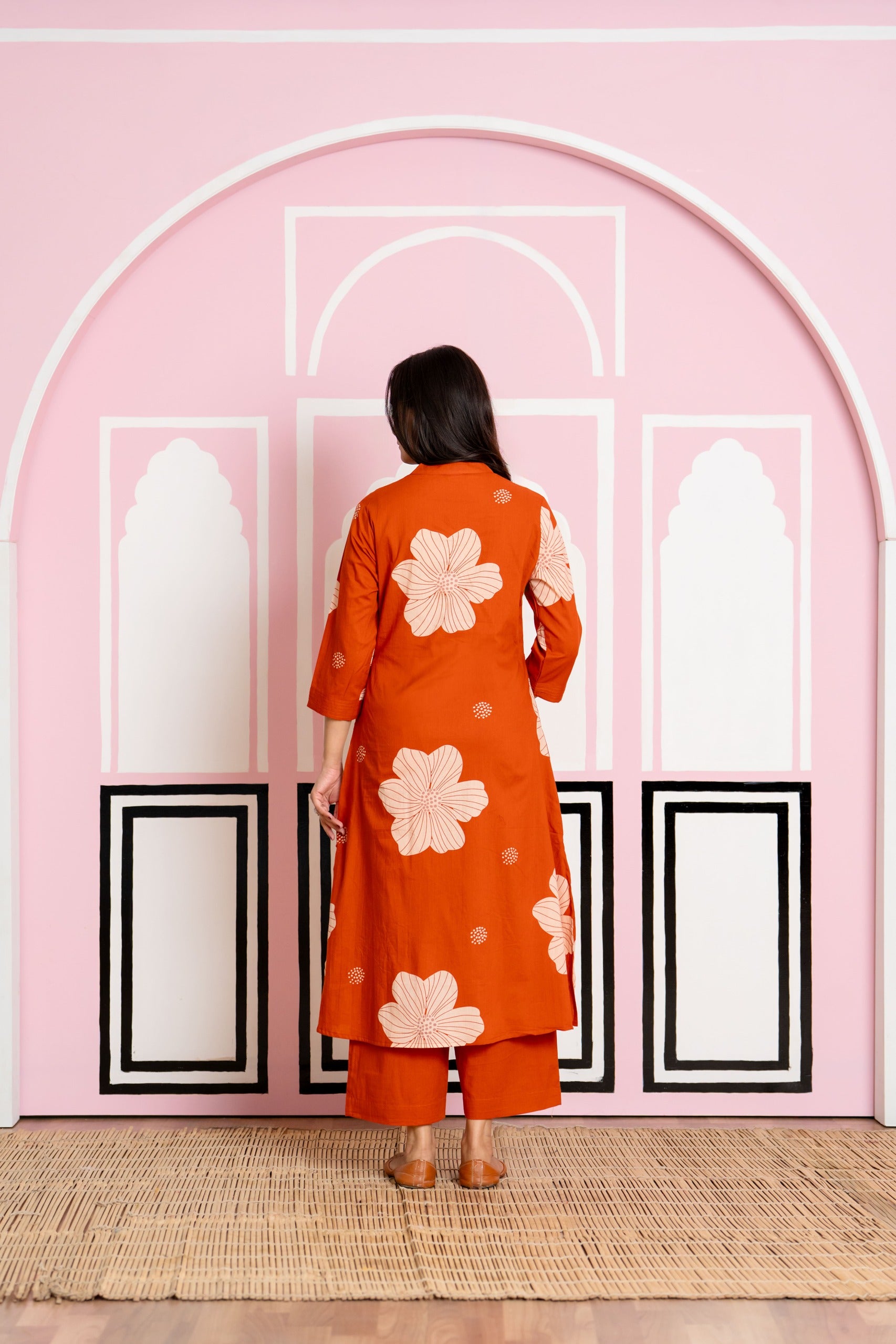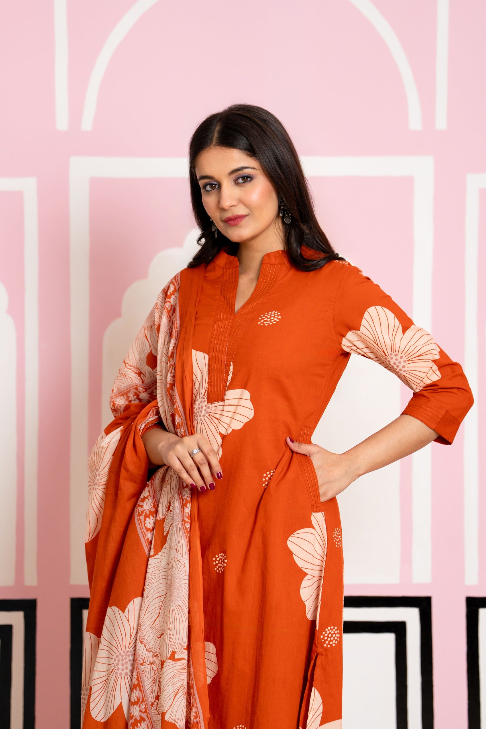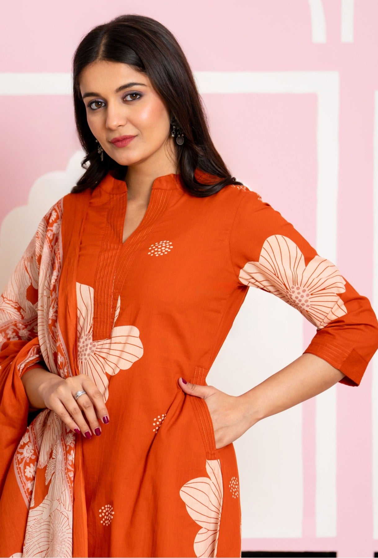 Sunset Orange Cotton Suit with Printed Palazzo & Dupatta