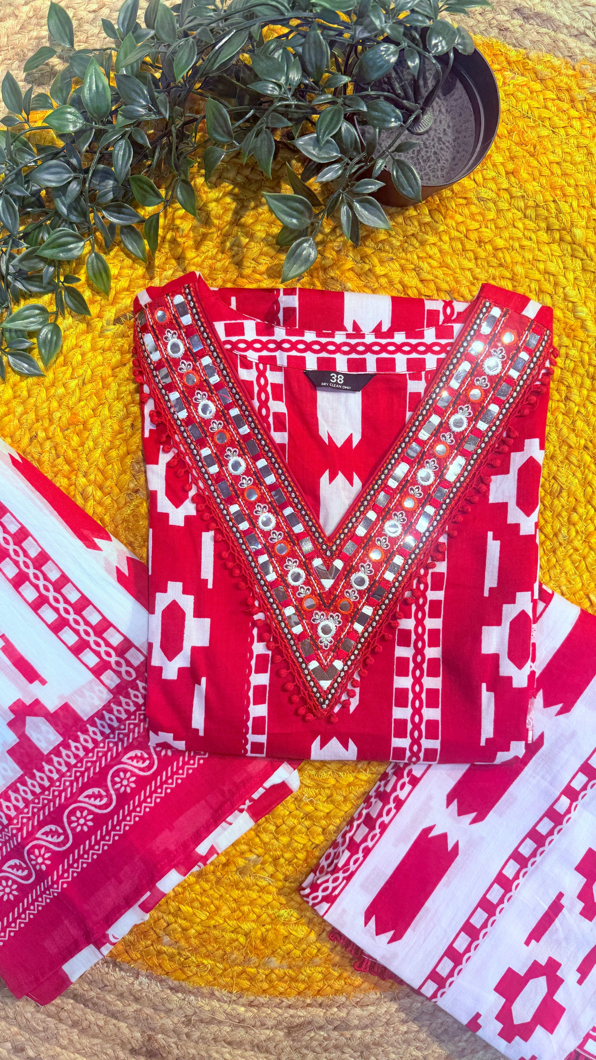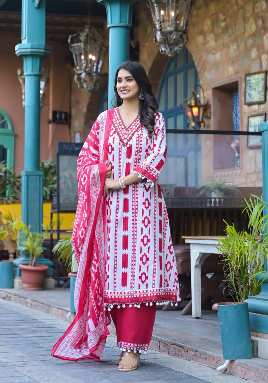 Infuse your everyday style with playful elegance through this Pink Cotton Suit, adorned with geometric ethnic motifs and charming pom pom accents. Designed for women who love comfort without compromising on statement fashion, this suit is a blend of effortless beauty and cultural flair.