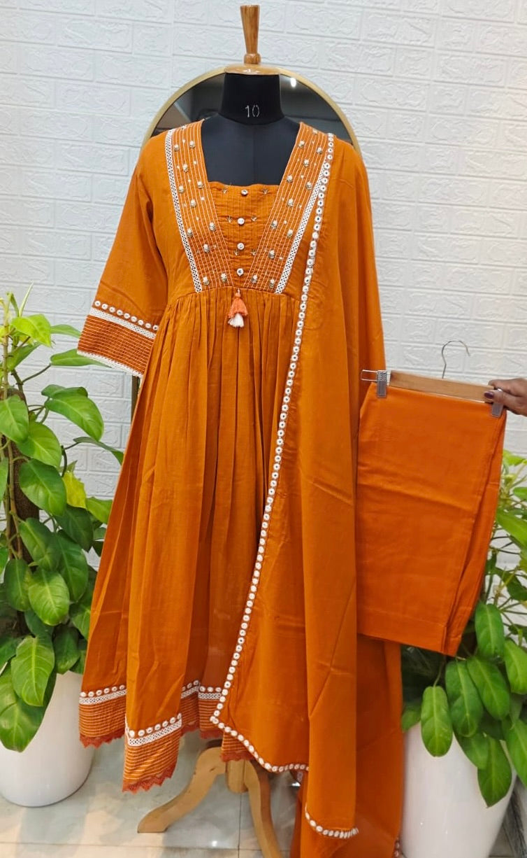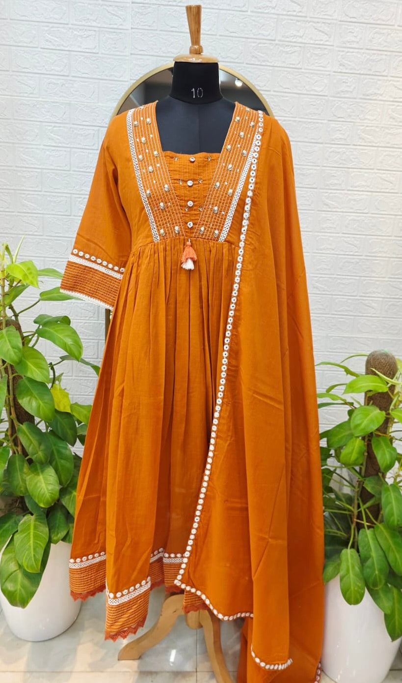 Premium Mul Cotton Partywear Anarkali Suit with Mirror Work & Elegant Dupatta β Burnt Orange