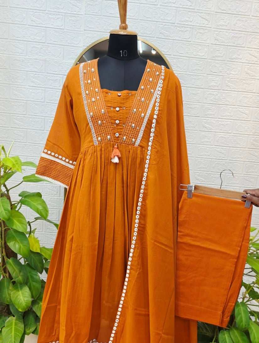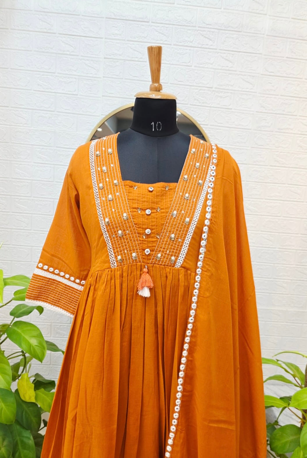 The vibrant burnt orange shade paired with delicate mirror embellishments creates a festive-ready look that feels both elegant and comfortable. The breathable mul cotton fabric ensures ease of wear, while the flowing Anarkali silhouette adds graceful movement, making it perfect for celebrations and special occasions.