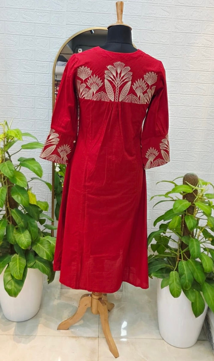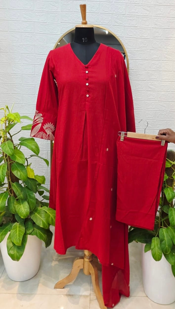 Make a bold yet elegant statement with this stunning ruby red cotton suit set, designed to combine simplicity with refined craftsmanship. The kurta features a clean straight silhouette enhanced with delicate embroidered motifs scattered across the fabric, creating a subtle yet graceful aesthetic. The V-neckline with button placket detailing adds a modern touch, while the intricately embroidered sleeve accents bring artistic charm to the overall design.
