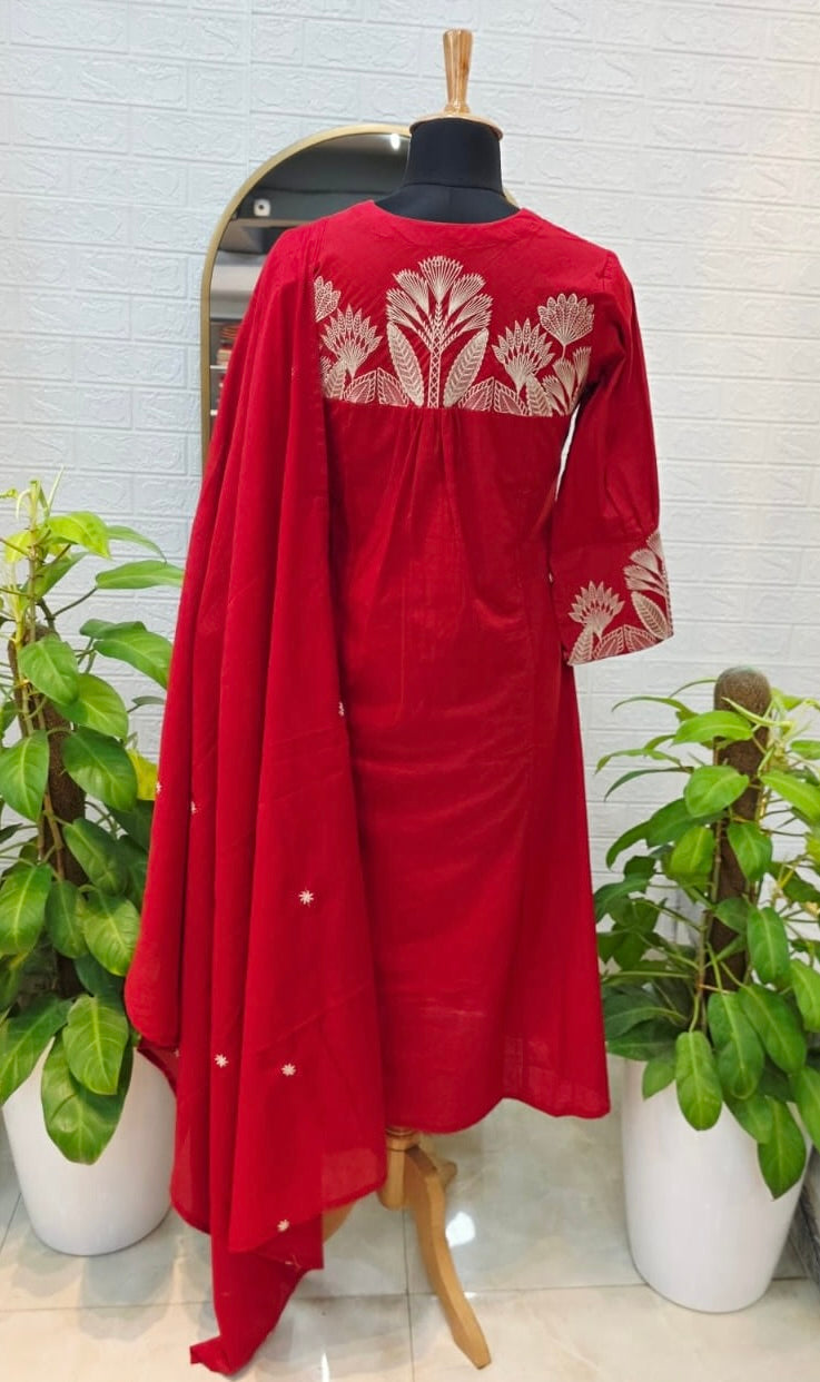 Premium Elegant Cotton Suit Set with Embroidered Detailing – Ruby Red