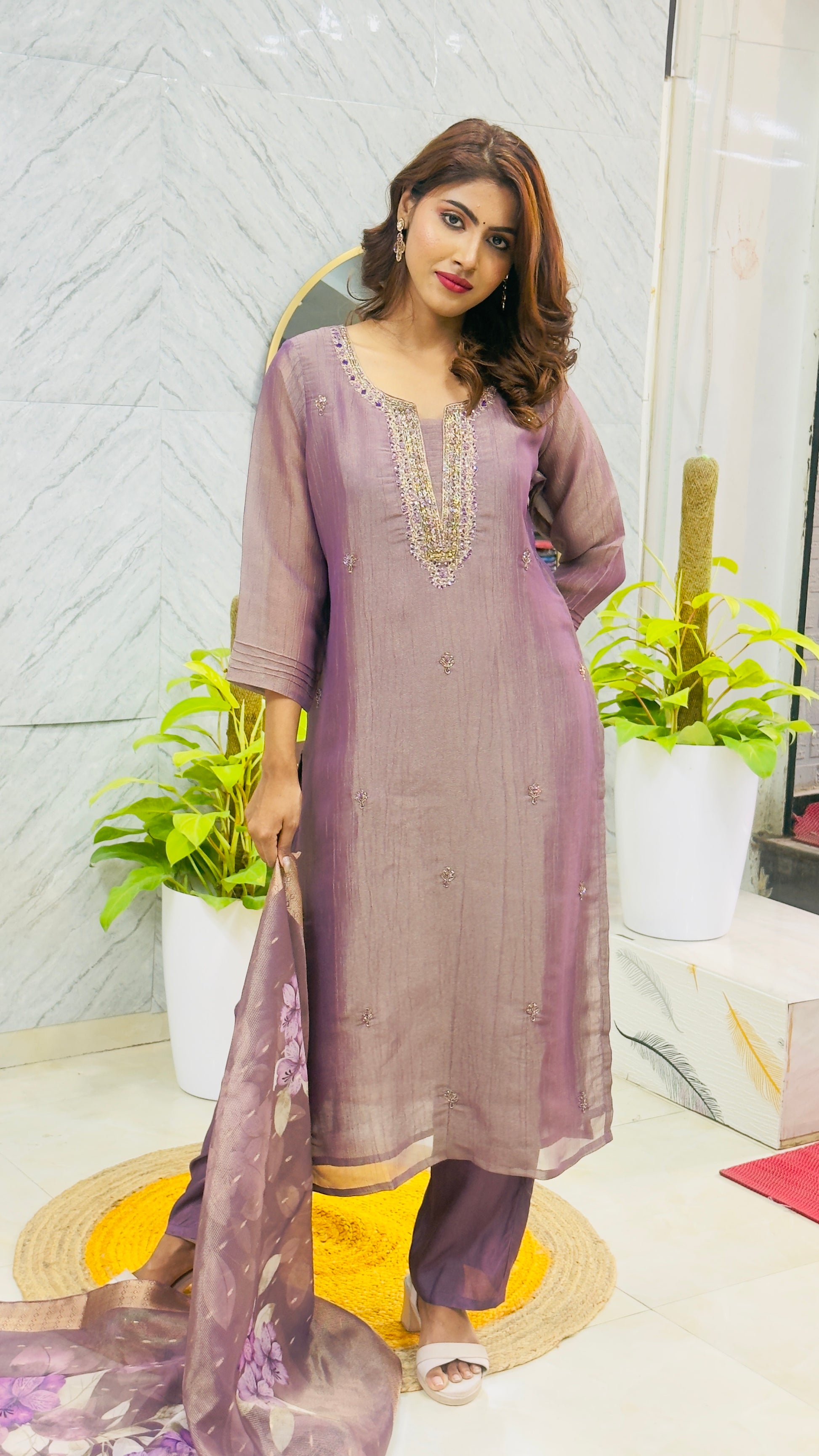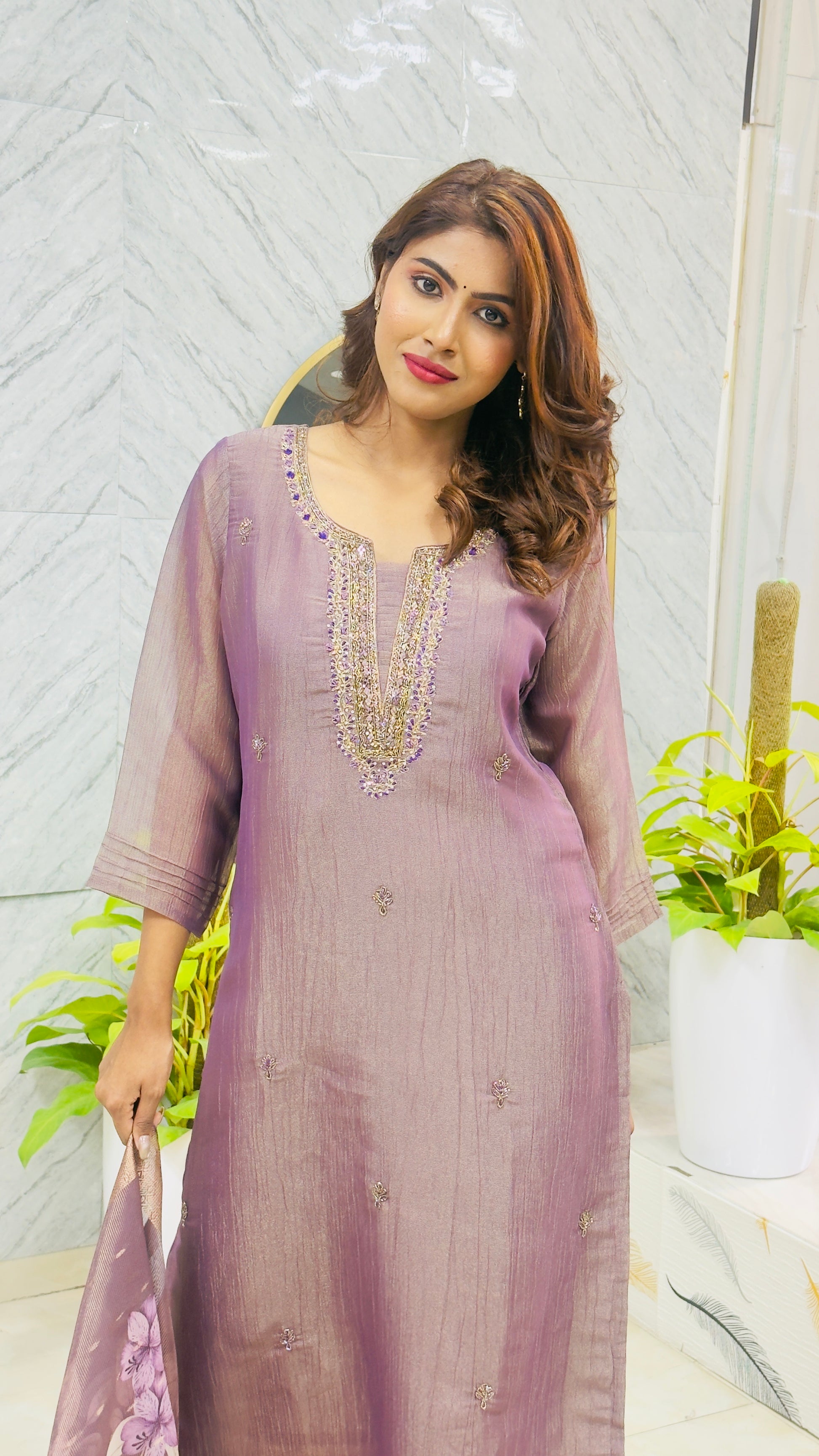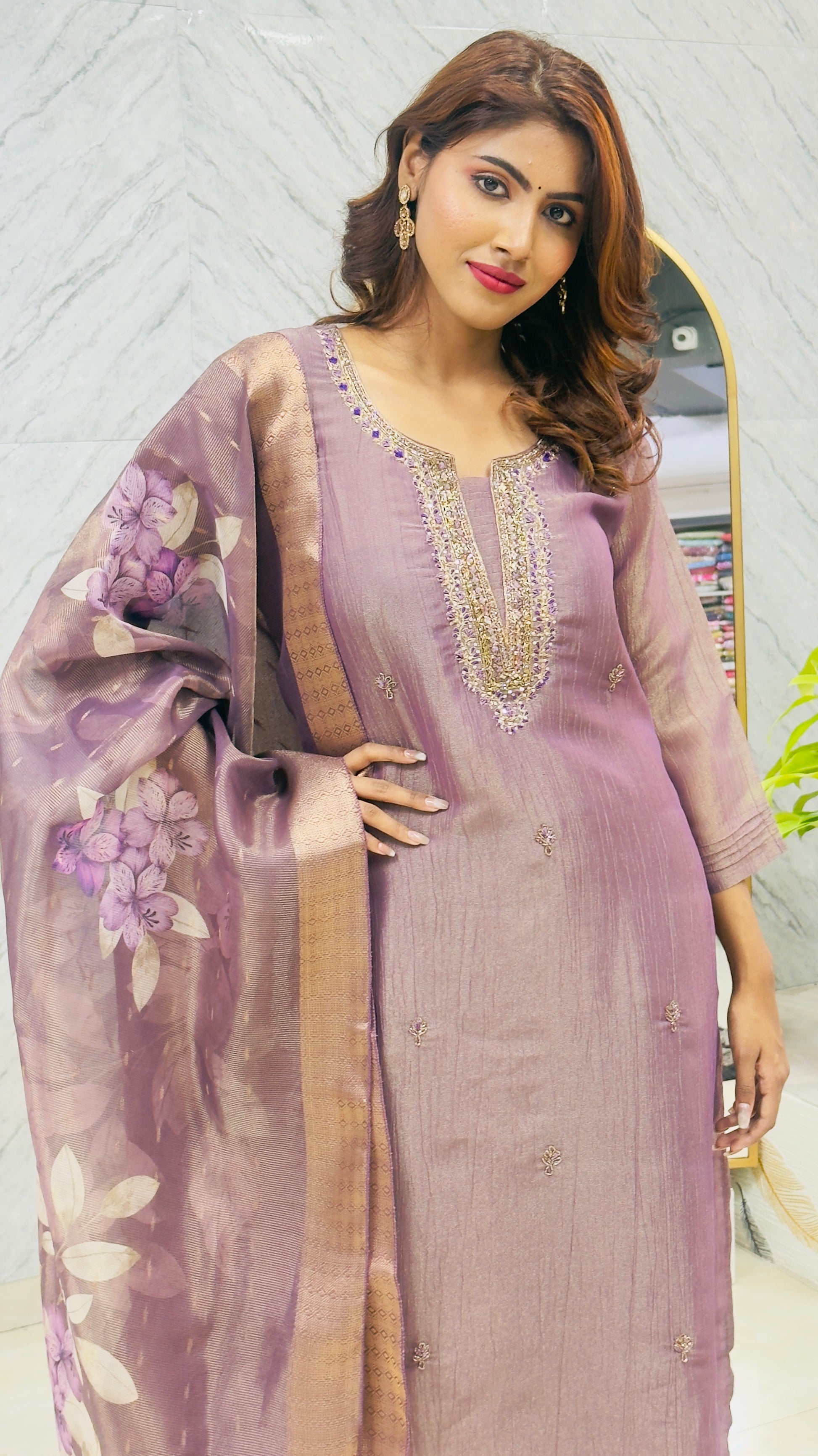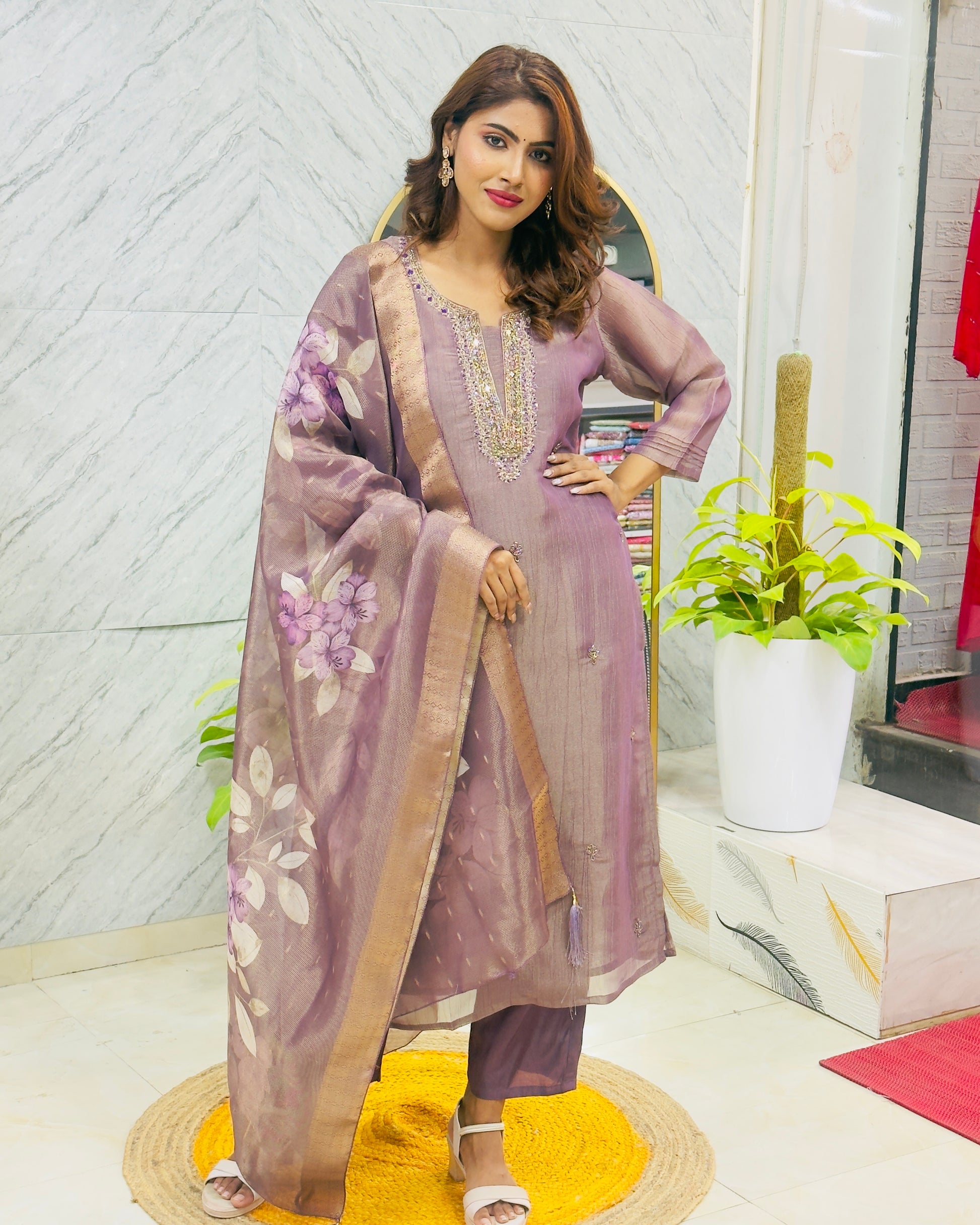 Step into sophistication with this elegant Tissue Silk Suit in a rich purple tone. Designed with intricate handwork near the neck yoke, this outfit radiates festive charm and refined beauty. The look is completed with a flowy digital print dupatta, adding a modern twist to traditional elegance. Perfect for weddings, festive occasions, and evening gatherings.