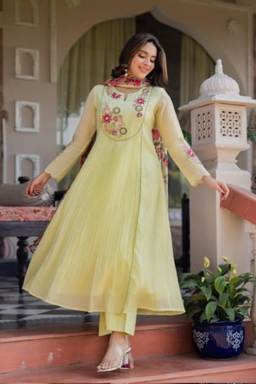 Premium Mul Cotton A-Line Suit Set with All-Over Embroidery & Digital Organza Dupatta β Lemon Yellow