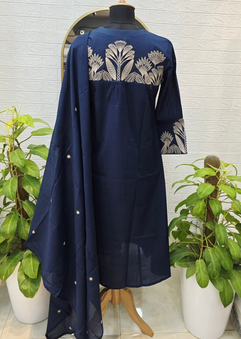 The deep navy blue shade paired with delicate embroidery creates a timeless and versatile outfit. Comfortable, breathable, and effortlessly stylish, this suit set is perfect for women who appreciate understated elegance and everyday ethnic fashion.