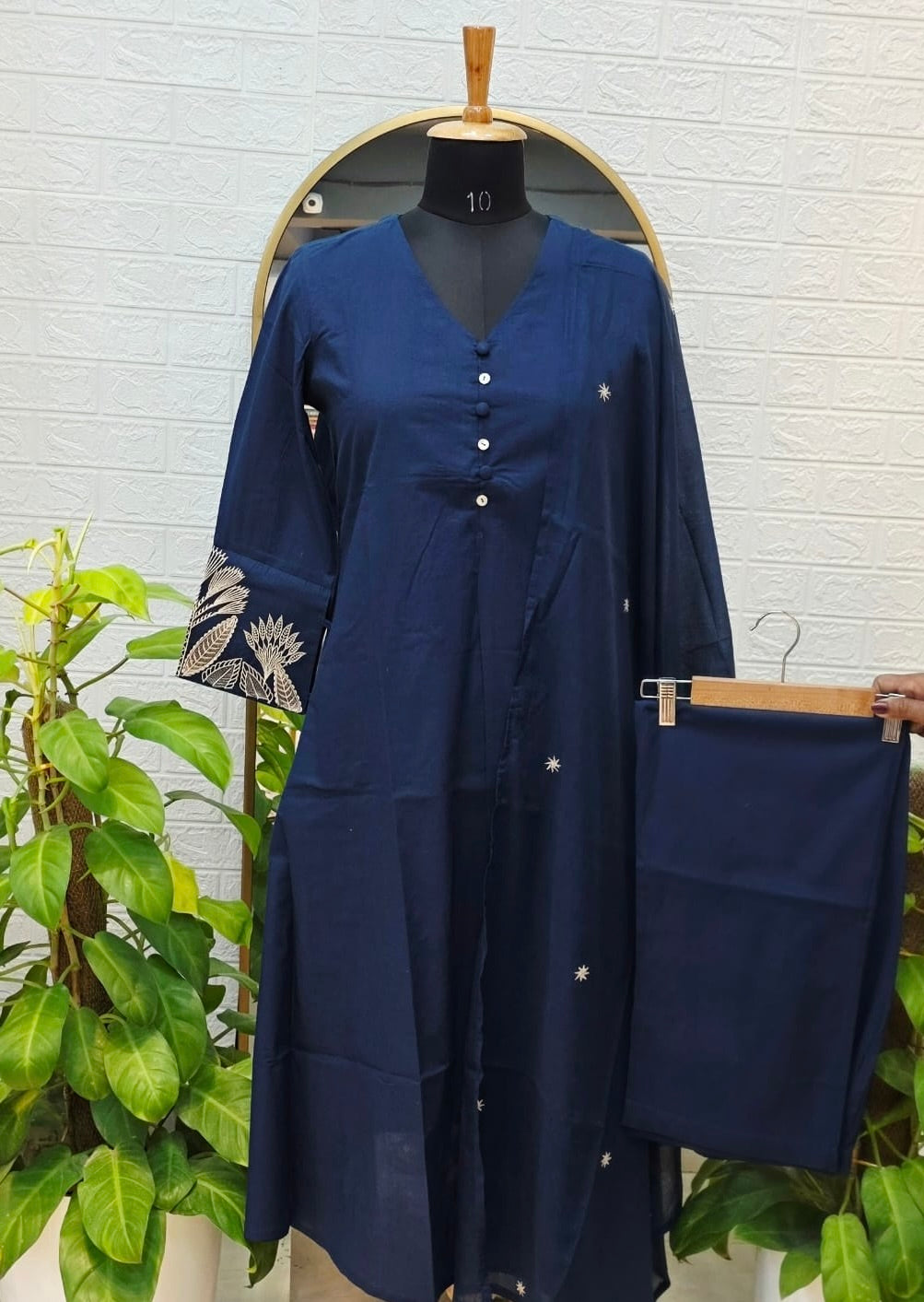 Elevate your everyday ethnic style with this elegant navy blue cotton suit set, designed for effortless sophistication and comfort. The kurta features a clean and minimal design enhanced with delicate embroidered motifs scattered across the fabric, creating a refined and graceful look. The V-neckline with button detailing adds a modern touch, while the intricately embroidered sleeve accents bring subtle artistic charm to the outfit.