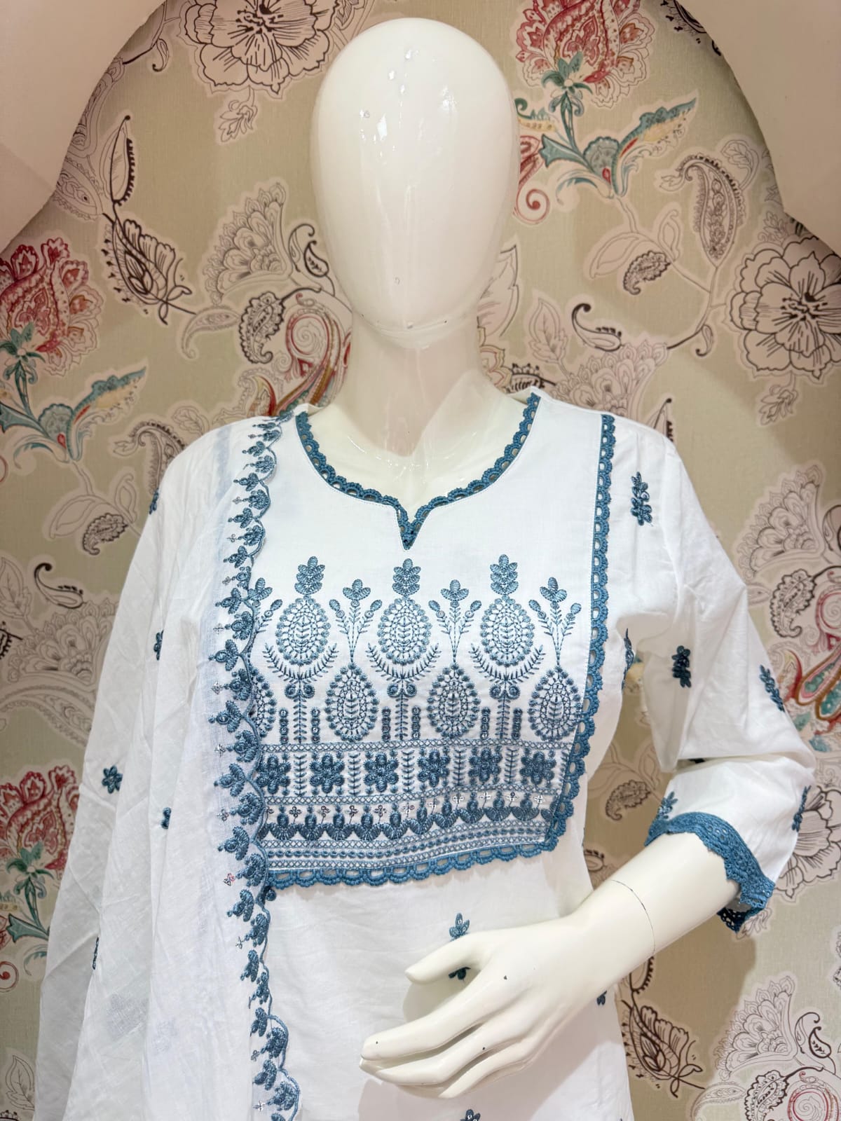 White Cotton Suit with Grey Thread Embroidery & Chikankari-Style Dupatta